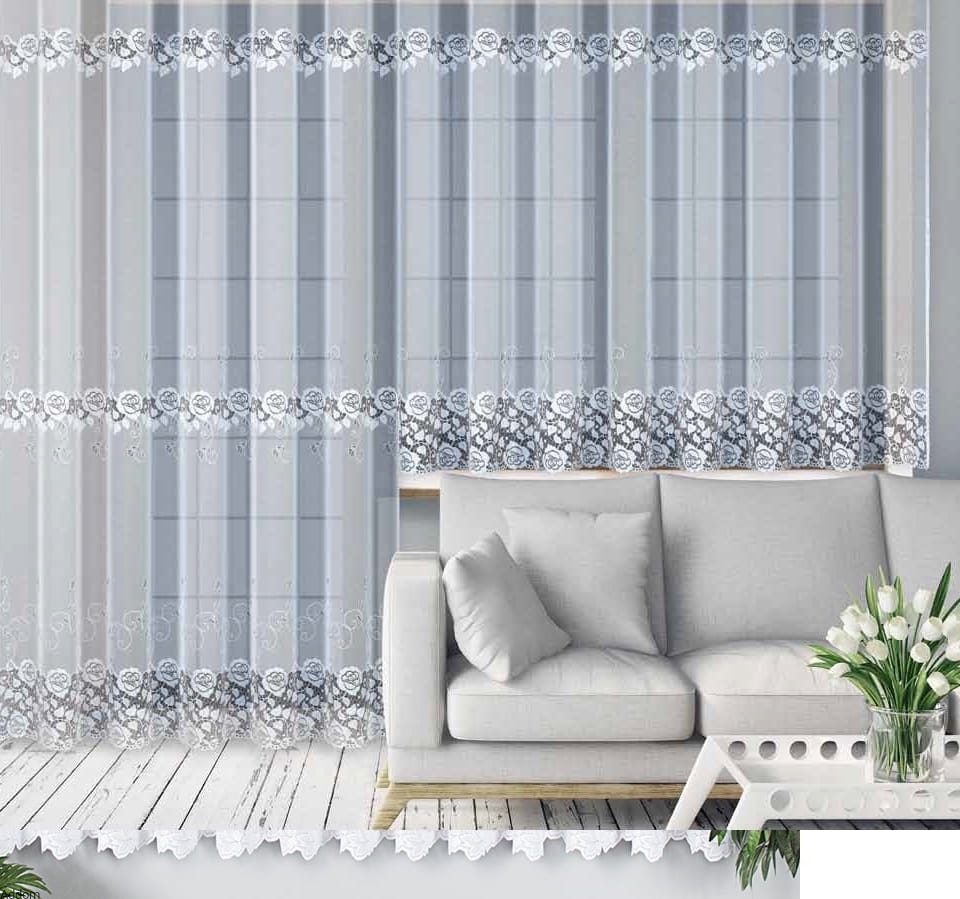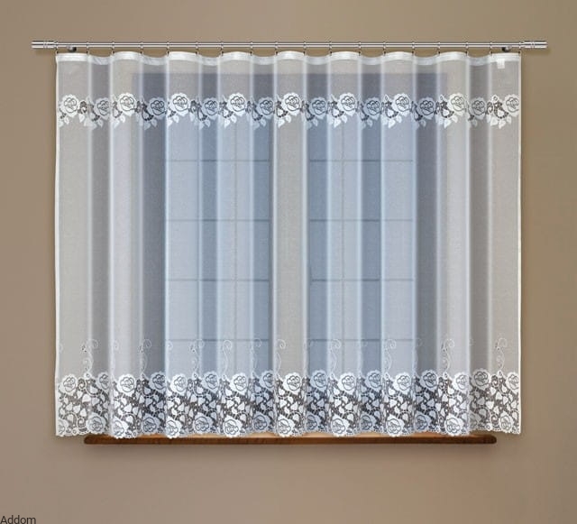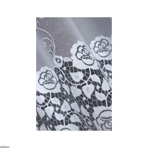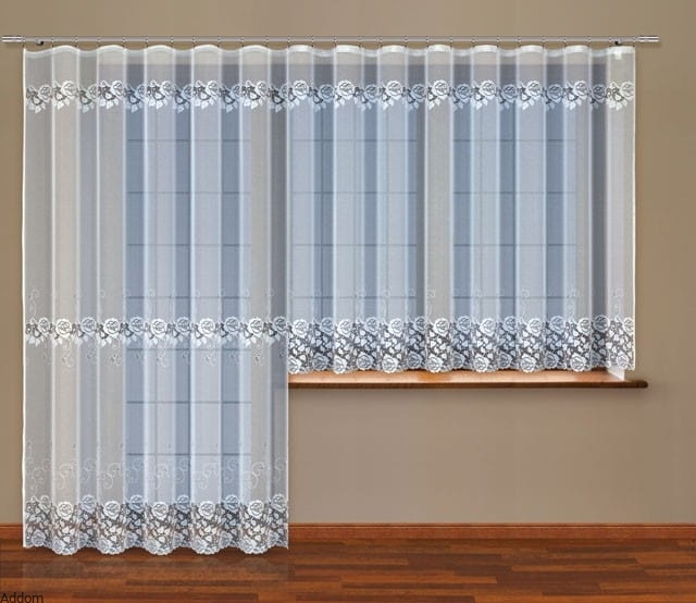 Firany gotowe w róże umieszczone górą i dołem prostych wykończeń każdej wersji firan, a jest ich aż 4 - dwie krótkie, i dwie wysokie, na 240 lub 250 cm. Firany są subtelne, przez ażurowe pasy z różami widać kontrastujące tło znajdujące się za firankami. Każda z firan ma uniwersalną taśmę marszczącą.