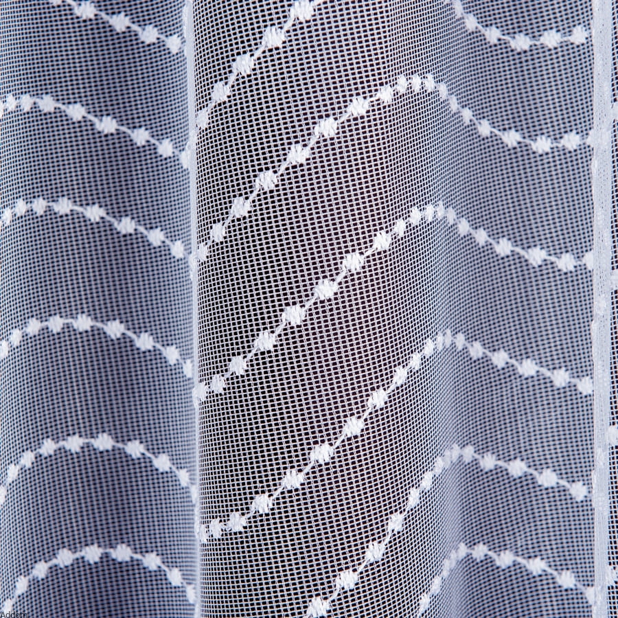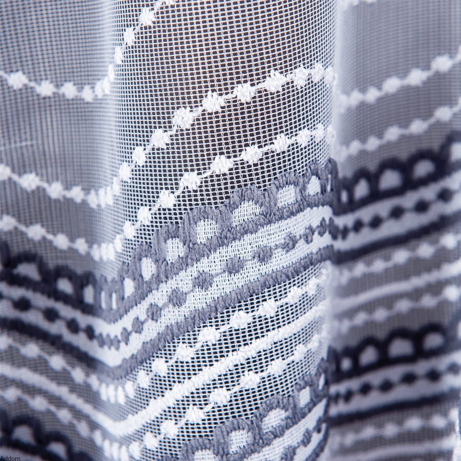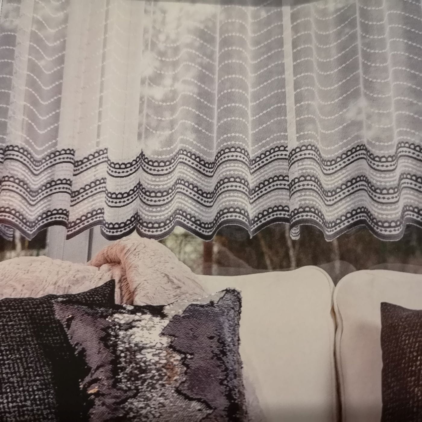 Firany żakardowe z haftem maszynowym - jest to specjalny ścieg, który tworzy na firanie dekorację wyglądającą jak haft. Dołem umieszczono dużo zdobień białych lub z grafitową nicią, górą falistych wzorów jest coraz mniej a firana bardziej prześwitująca. Górą, od spodniej strony znajduje się doszyta taśma marszcząca, boki są obszyte. Tło tych firan zostało wykonane tak, by wyglądało w sposób zbliżony do koronki.