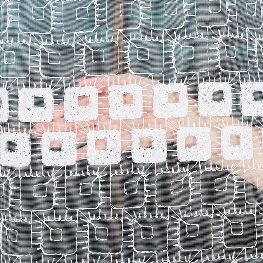 Na miniaturze real foto widzicie Państwo grubość haftu gipiurowego, jak jest on zwięźle i w sposób wypukły wkomponowany w tło. To perełka wśród firan haftowanych, wzbogacona opalizującą nicią, co dodaje im wykwintności i unikalności. Jeśli mamy okna, na które padają promienie słoneczne, nić ta będzie błyszczeć kolorami tęczy, taki efekt uzyskamy też wieczorem, przy mocnym świetle sztucznym.