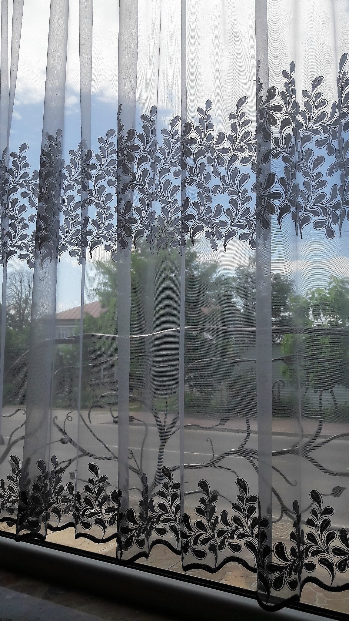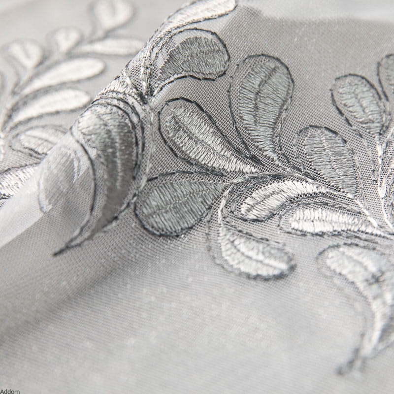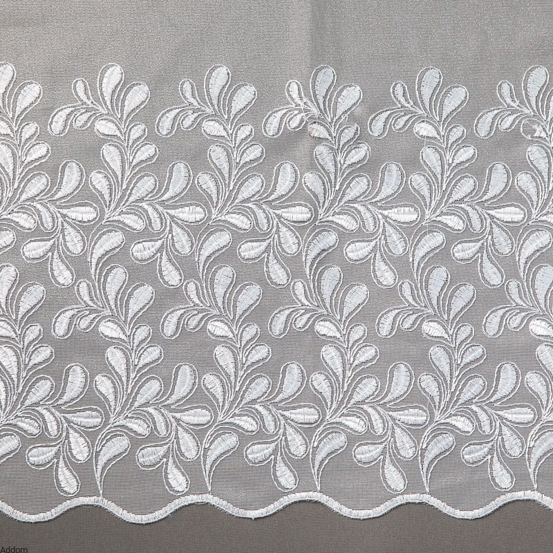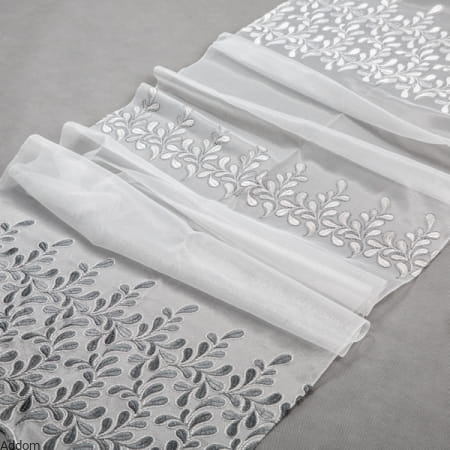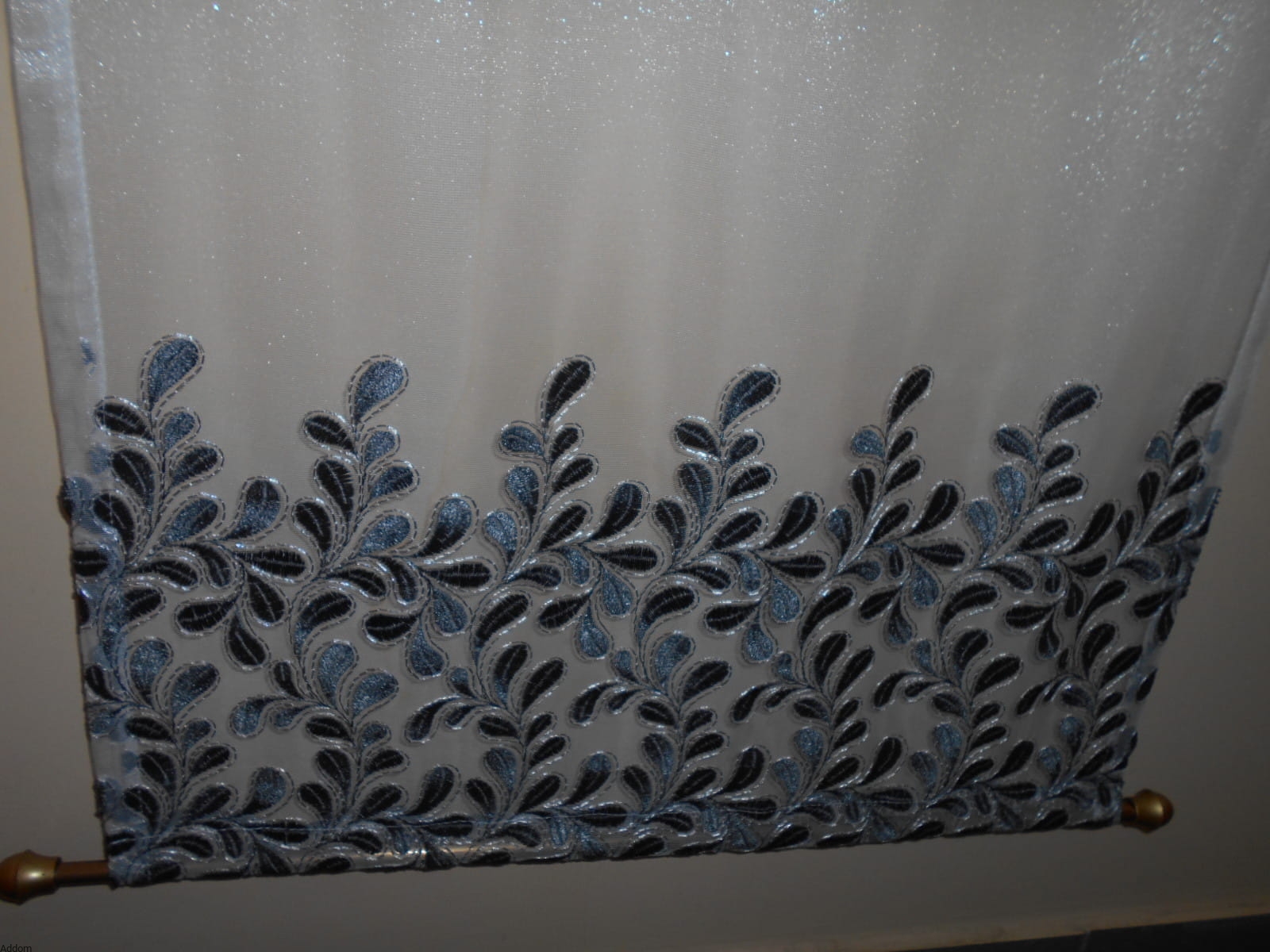 Firany o pięknym połysku, z markizety o ekskluzywnym wyglądzie, w której odbija się słońce iskrząc na całej firanie. Wysokość firan to 180 lub 280 cm, firany na 180 cm mają 2 rzędy szerokiego pasu w liście, a firany na 280 3 pasy haftu.
