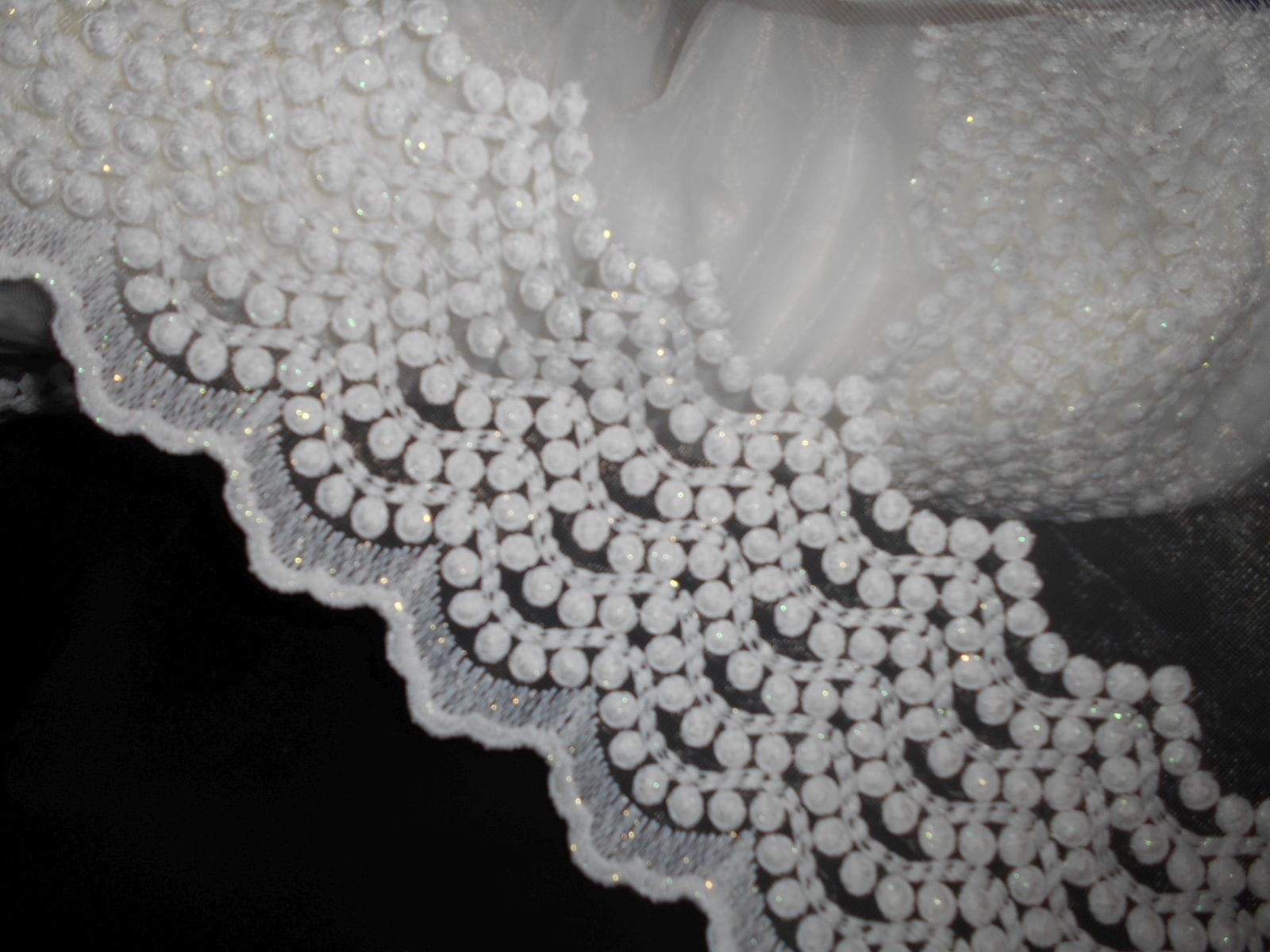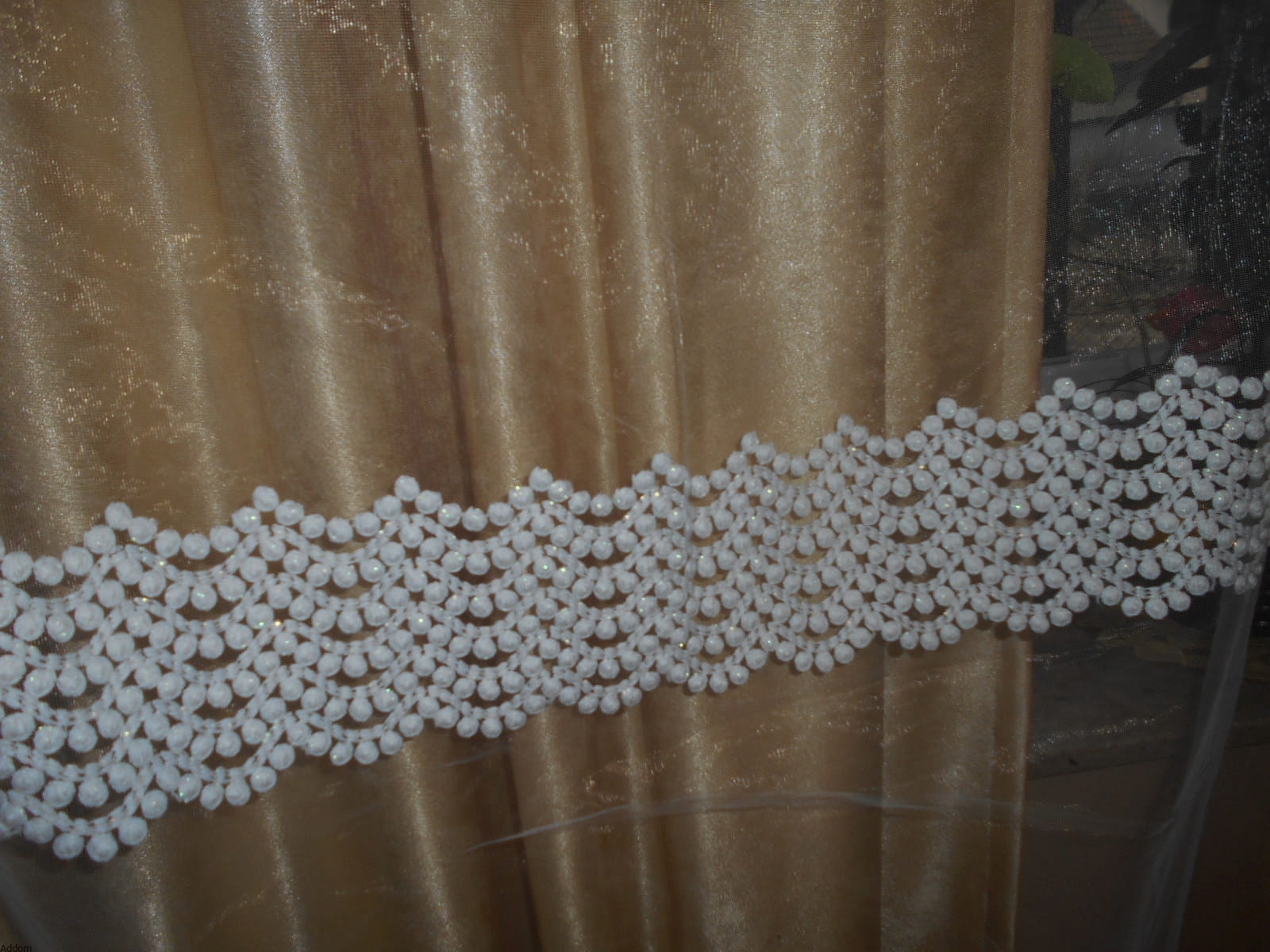 Żadne zdjęcie nie odda piękna tej firany, ale pstryknęliśmy kilka zbliżeń, by przybliżyć Państwu ten niesamowity model. Widać na nich trójwymiar haftu - kropeczki to kuleczki wystające z tła, tło błyszczy złotym blaskiem, a to wszystko jeszcze przyozdobione opalizującą nicią, której w tym modelu nie żałowano, jest jej dużo, aby podkreślić mocniej bogactwo tego wzoru. Wzór wygląda, jakby naszyto na niego korale ułożone w falbany.