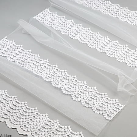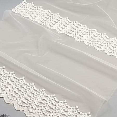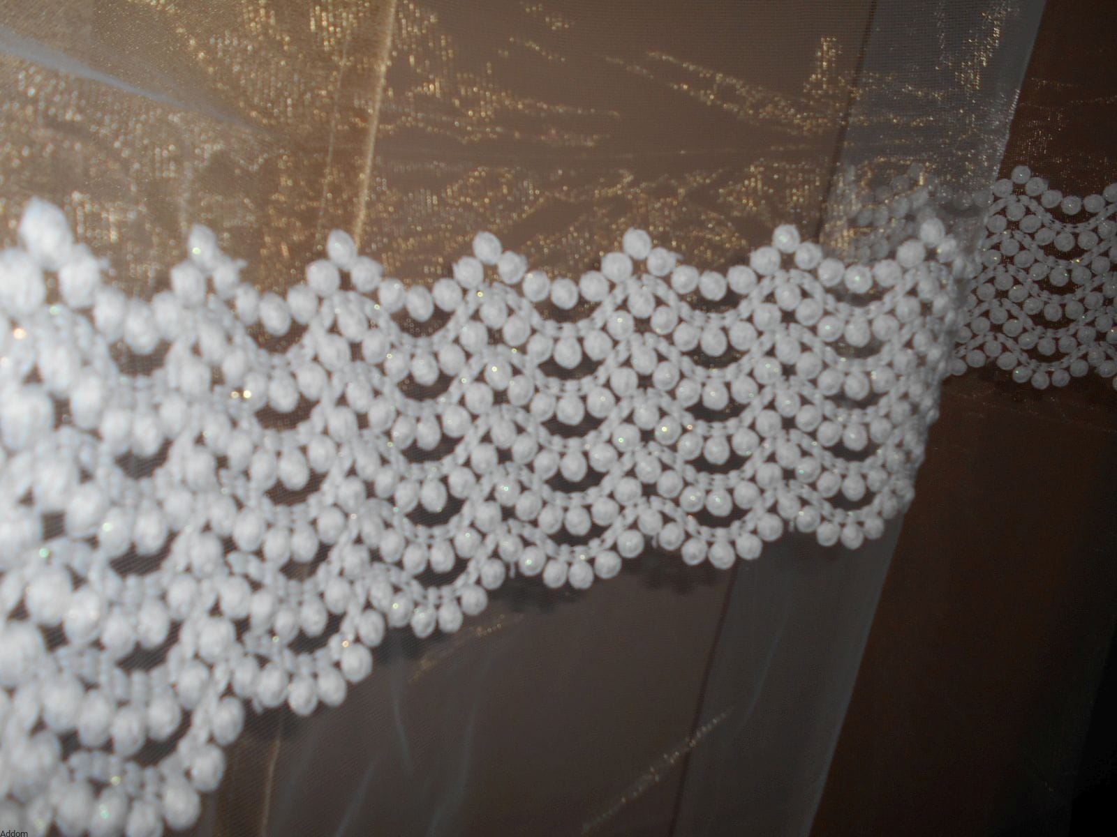 Poszukujecie Państwo firan ekskluzywnych ale nietuzinkowych? Oto one! Firany niemal niewidoczne, o wysokości 280 cm, o eleganckim wzorze haftowanym, który wystaje mocno z delikatnego tła, i jest on przyozdobiony opalizującą nicią. Tło jest prawie niewidoczne, jednak do światła mieni się w kolorze złotym, a na tle firany umieszczone jest 4 szerokie pasy haftu, który mocno wystaje z tła. Ma on formę falbanek, nić jest połączona z opalizującą, połyskującą nicią, która do światła mieni się wszystkimi kolorami tęczy. Niesamowite dzieło sztuki tekstylnej, subtelna biżuteria okienna.