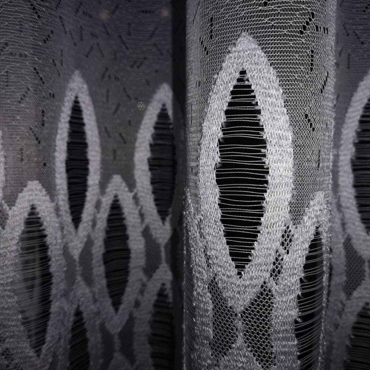 Górne tło jest gęste ale wykonane z subtelnej przędzy, nie tworzy charakterystycznych dla żakardu siatek i oczek, ale jest gładkie jak tkanina, z nieznacznymi otworkami, uatrakcyjniającymi tło. Dekoracyjny dół w koła jest gruby i wygląda jak gipiura, ponadto gruby wzór podkreślono wystającymi nitkami, aby wydawał się jeszcze bardziej trójwymiarowy a koła wypełnia cieniutka, niewidoczna z daleka przędza.