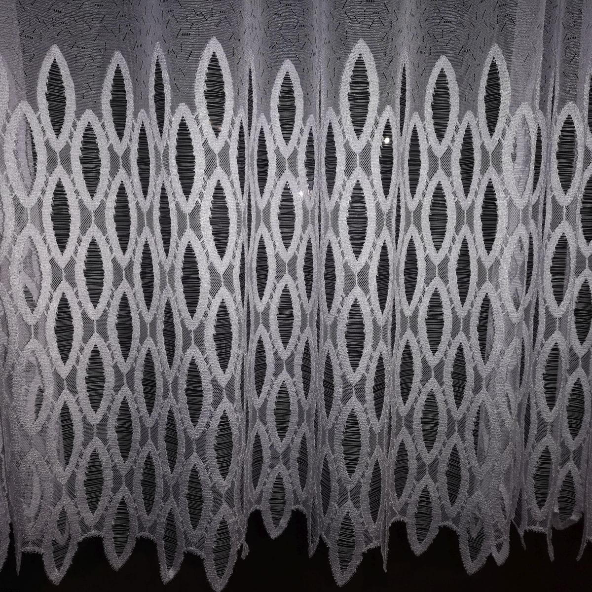 Firany kaliskie z kolekcji LUX COLLECTION, w formie gęstej góry i dołu z przejrzystymi, owalnymi kołami. Firanki te są nowoczesne i dopracowane w najmniejszym szczególe, co charakteryzuje całą tę kolekcję Lux. Wzory w postaci kół zajmują 60cm firany, czyli w wersji na 140cm będzie to prawie połowa firany, a w firanie na 250cm, szeroki, ładnie obciążony dół.