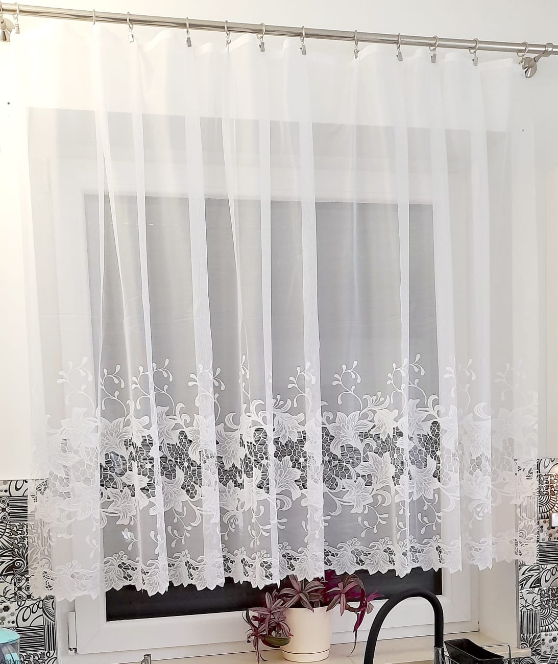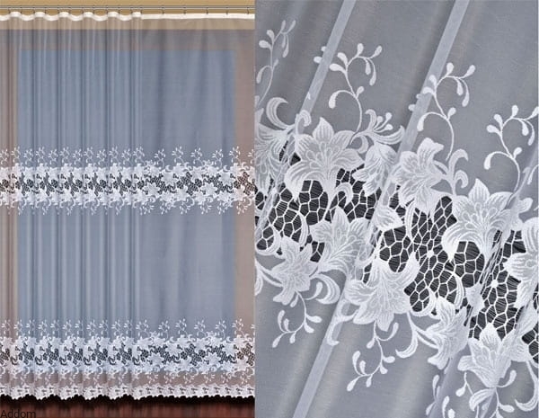 Nieprzeciętnej urody firany kaliskie o gęstym tle i rzędach kwiatów lilii, pomiędzy którymi umieszczony został ażur o kształcie plastra miodu. Firanki pochodzą w kolekcji Trends, wyglądają jak tkanina ze względu na bardzo bliskie umieszczenie nici, taki był zamysł projektantów, by firany wyglądały jak szlachetny materiał. Wzór natomiast przypomina wstawkę gipiurową, otoczoną haftem kwiatowym, ale to tylko wrażenie, gdyż wszystko jest w technologii żakardu. Tło jest jednolite, gęste, charakterystyczne dla firan z całej kolekcji Trends Collection, będącej zbiorem firan o nowoczesnym design.