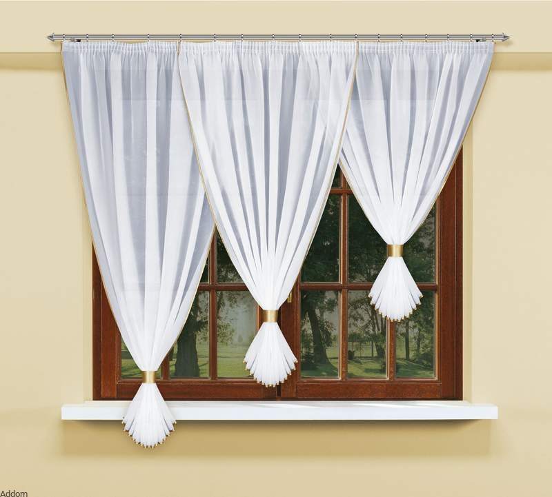 Firany z pięknego woalu, 3 kokony zszyte na jednej taśmie marszczącej, które przed zmarszczeniem mają szerokość 350 cm, po zmarszczeniu 180-220, przy czym im mniejszy karnisz, tym kokony będą węższe, im szerszy, tym kokony bardziej rozpostarte. Każdy element jest obszyty złotą lamówką, posiada też w zestawie złote wiązanie, w które wsuwa się każdy element. W naszym sklepie można też kupić pojedyncze firany do upinania w kokon. Najdłuższy kokon ma 160 cm wysokości, kolejne są o około 10 cm krótsze od poprzednika.