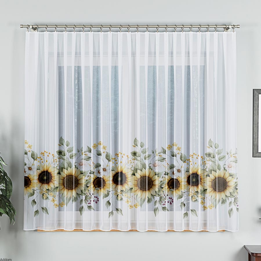 Barwy dominujące w firanach to żółty, słonecznikowy kolor kwiatów, i zielone listeczki. Większość słoneczników znajduje się na dole firany, jednak góra też nie jest pusta, umieszczono na niej mniejsze główki kolorowych kwiatów. Firany mają przeznaczenie głównie kuchenne, ze względu na rustykalny charakter tych kwiatów, które po przekwitnięciu trafiajądo kuchni jako pożywienie.