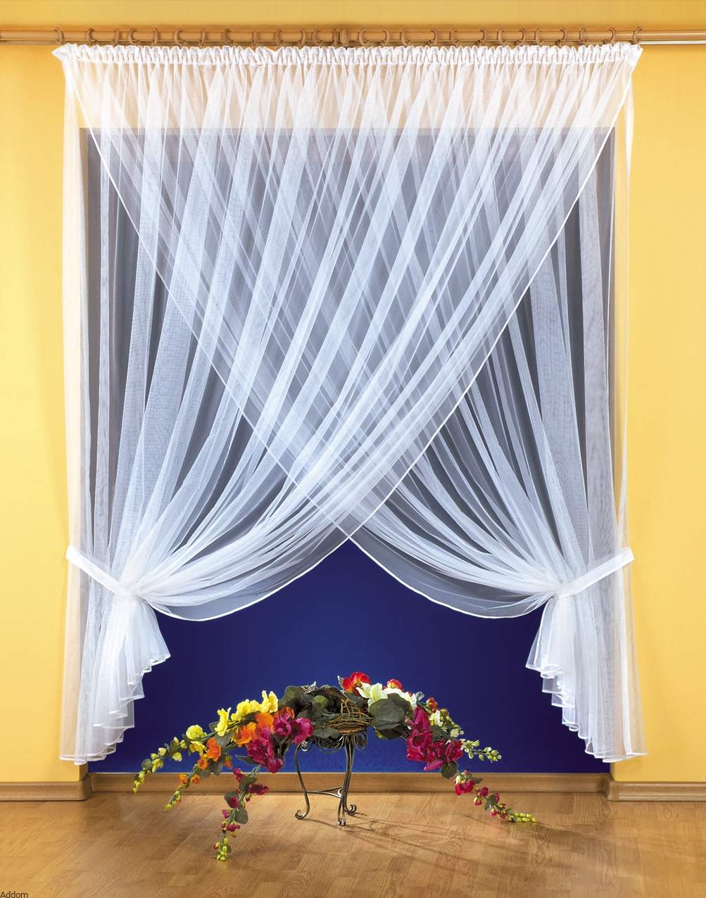 Firany są z siateczki, ale są gęste bowiem do jednej taśmy doszyte są aż 2 szale, materiał jest więc podwójny. Bez upinania firana tworzy białe tło, można też upiąć na środku przedni szal, a tylni szal będzie stanowił tło. Bardzo duże pole do popisu daje ta firana, a wersje wysokie są idealne do drzwi balkonowych czy tarasowych. Zaletą tego materiału jest, że nie trzeba go prasować, prasują się same po powieszeniu wilgotnych na karniszu.