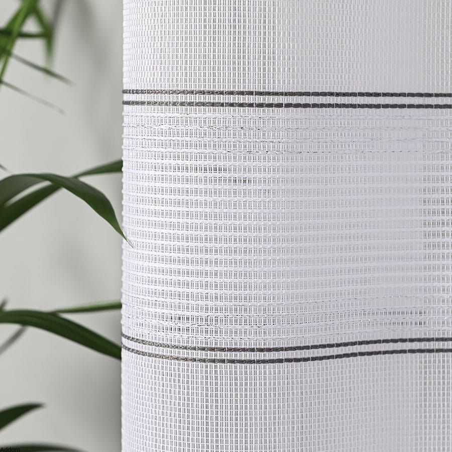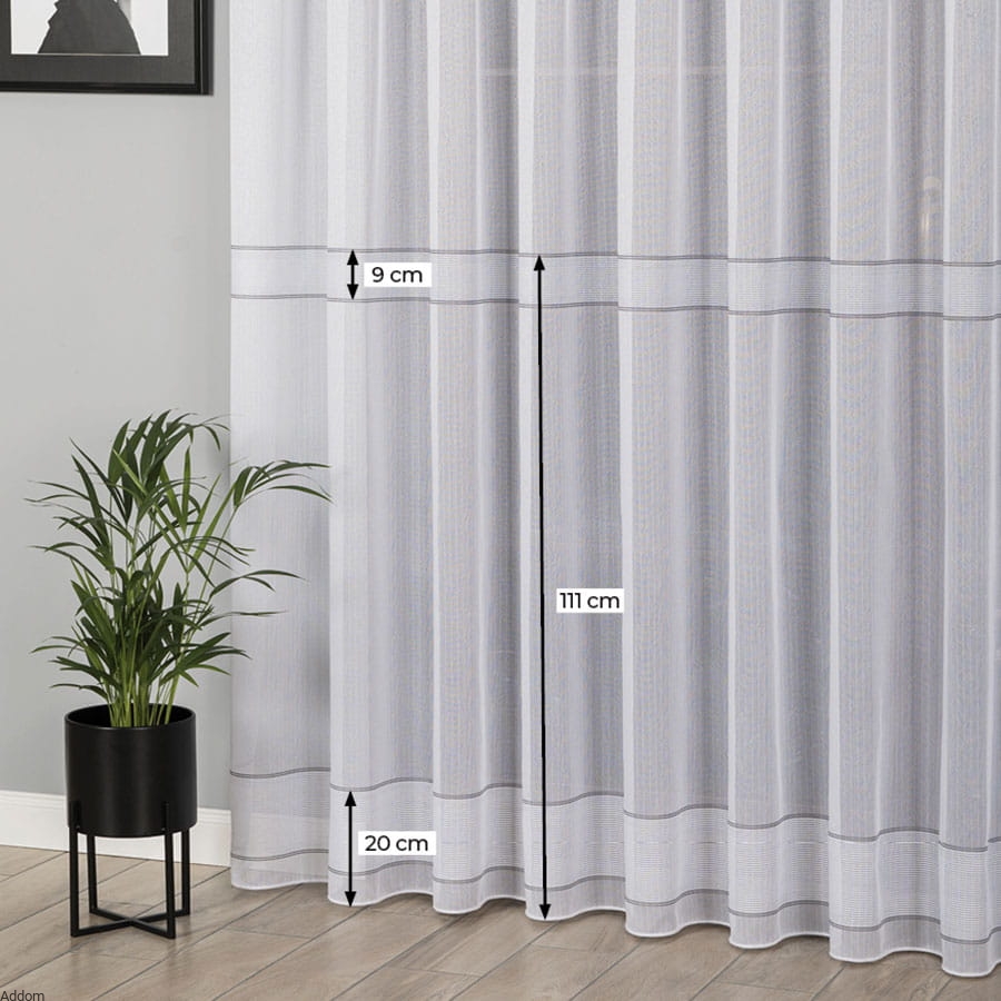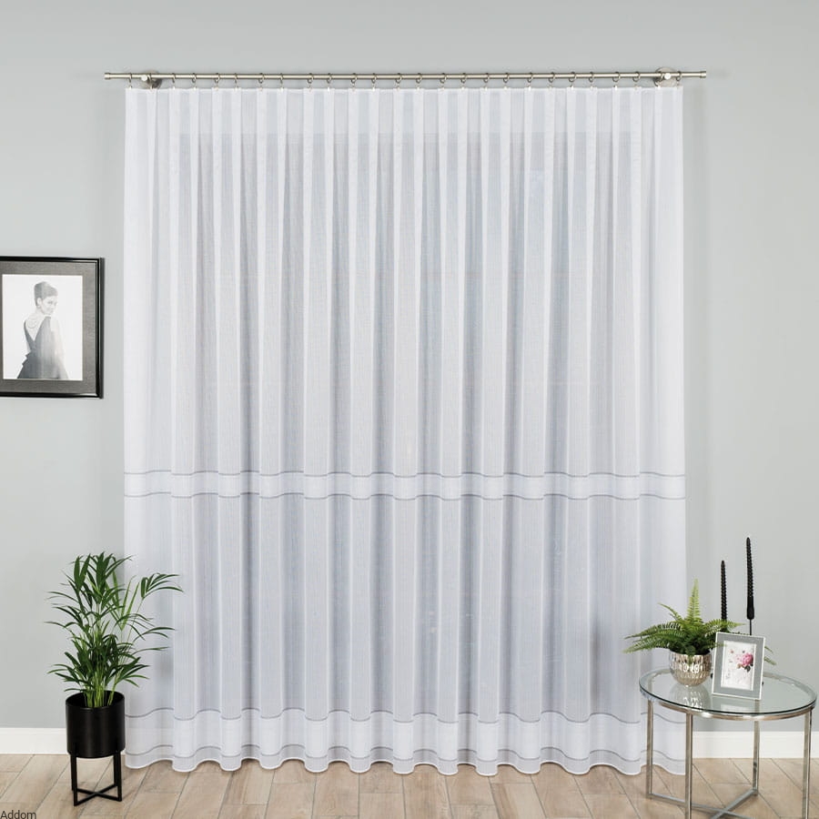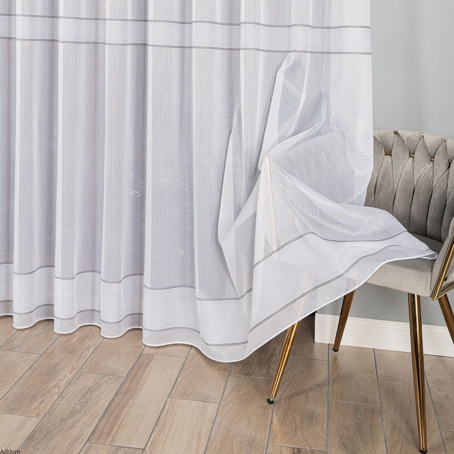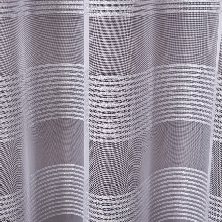 Firany na metry w drobne srebrne paski umieszczone rzędami dołem firany, a reszta firany jest całkiem biała. Firanki te mają obciążającą je ołowiankę, która zapewnia, że firanki świetnie się będą układać. Styl minimalistyczny, ale z nowoczesną stylizacją, ze srebrnymi paskami, które bardzo mocno błyszczą do światła. Cała firana jest biała, jedynie paseczki w wersji srebrnej są srebrne.