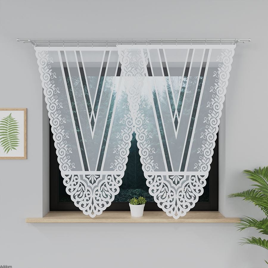 Sztywne, szerokie i przejrzyste panele żakardowe, o wykończeniu w formie trójkątów, przyozdobionych przejrzystymi paseczkami i ornamentami na ich dole.