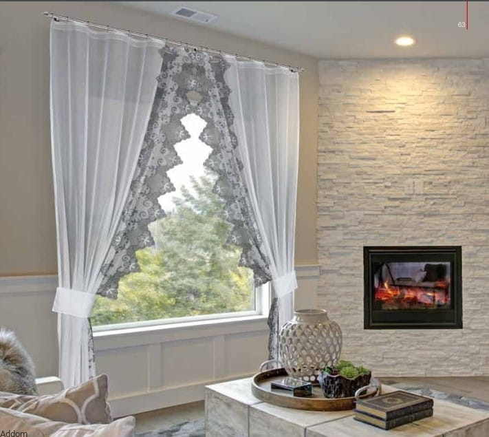 Firany z popielatymi wzorami, z ekskluzywnej dzianiny żakardowej wyglądającej jak tkanina. Firany stanowią 2 osobne szale, każdy z nich ma osobną taśmę marszczącą oraz zawieszkę do upinania firany.