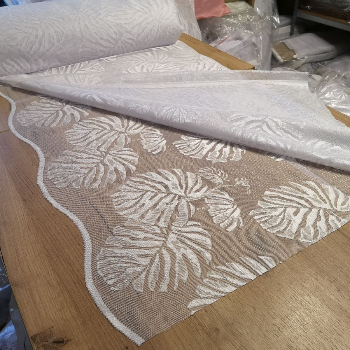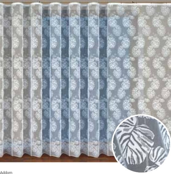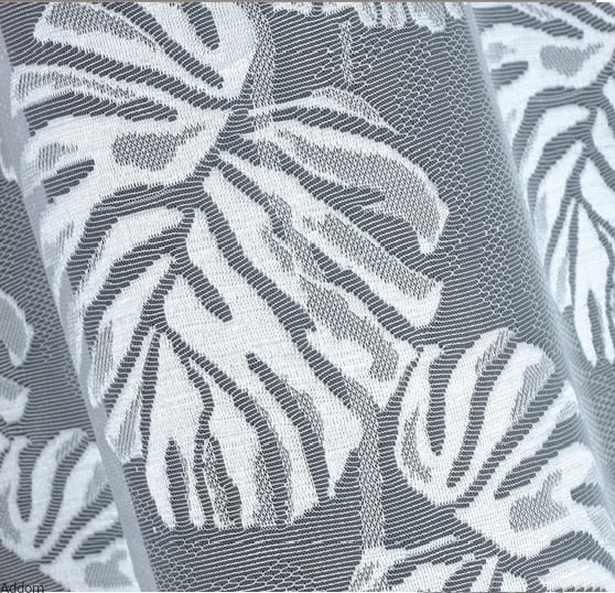 Firany w duże, liście egzotyczne z lasu deszczowego. Firany są pokryte dużymi liśćmi monstery - każdy motyw dekoracyjny ma 31 centymetrów, a dostępne w szerokiej gamie wysokości. Tło jest gładkie i przejrzyste, wykonane z cienkiej przędzy, a wzory dziany przez ściśle przylegającą nić, tworząc je wyrazistymi, na niewidocznym tle.
