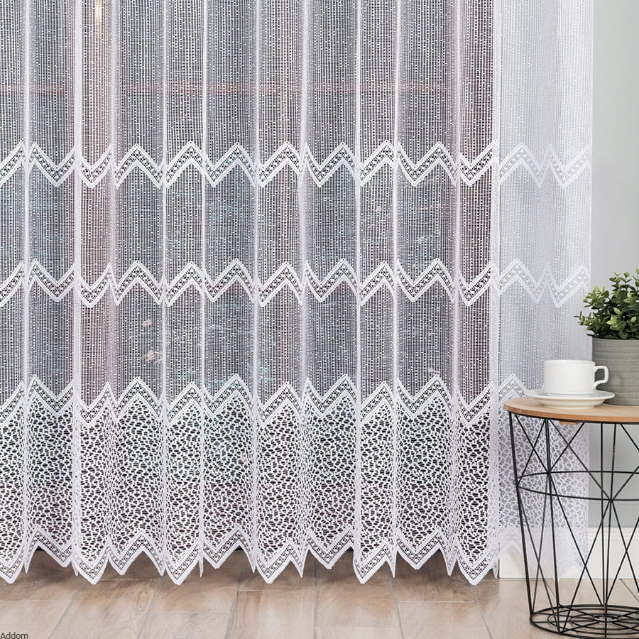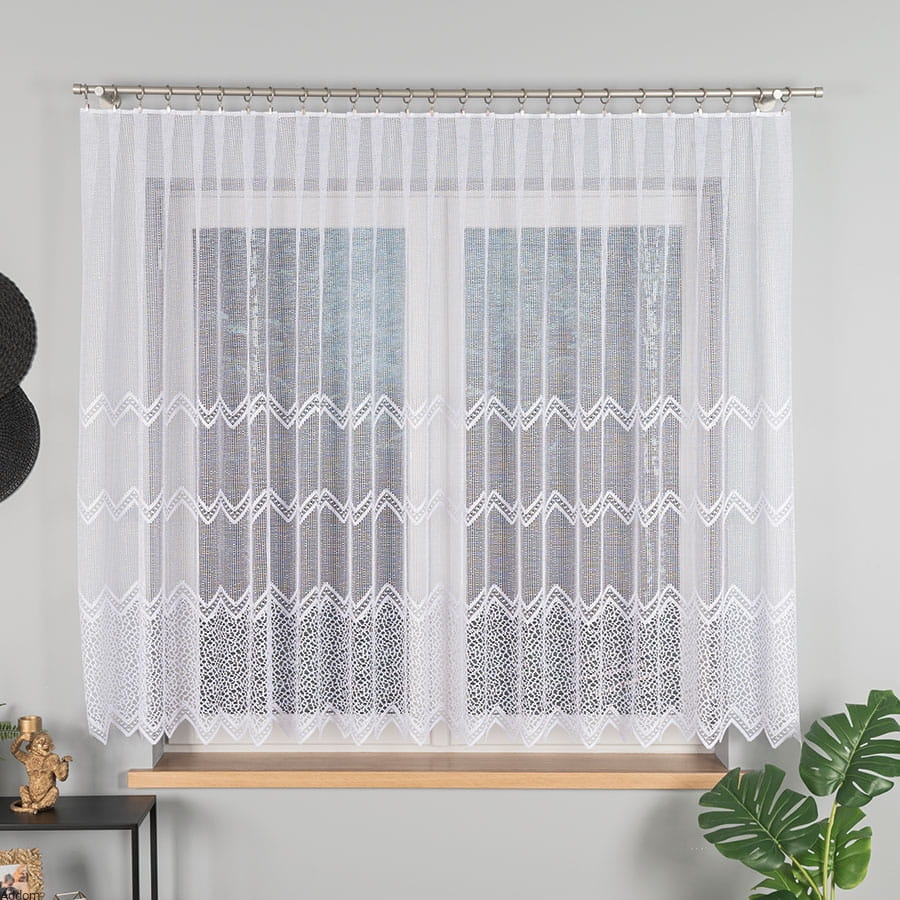 Estetyczne firanki żakardowe, poziomo zdobione szlakami w formie łagodnych, falowanych zygzaków, które zdobią firanę na jej całości. Firanki są świetnej jakości, bardzo precyzyjnie wykonane, i bardzo wzorzyste, można je odwracać, jeśli chcemy wykonać firany salonowe upinane na boki, lub jako dekoracje do drzwi balkonowych, które na środku będą mieć ładną, łagodną falę. Po odwróceniu wzory będą poziomo.