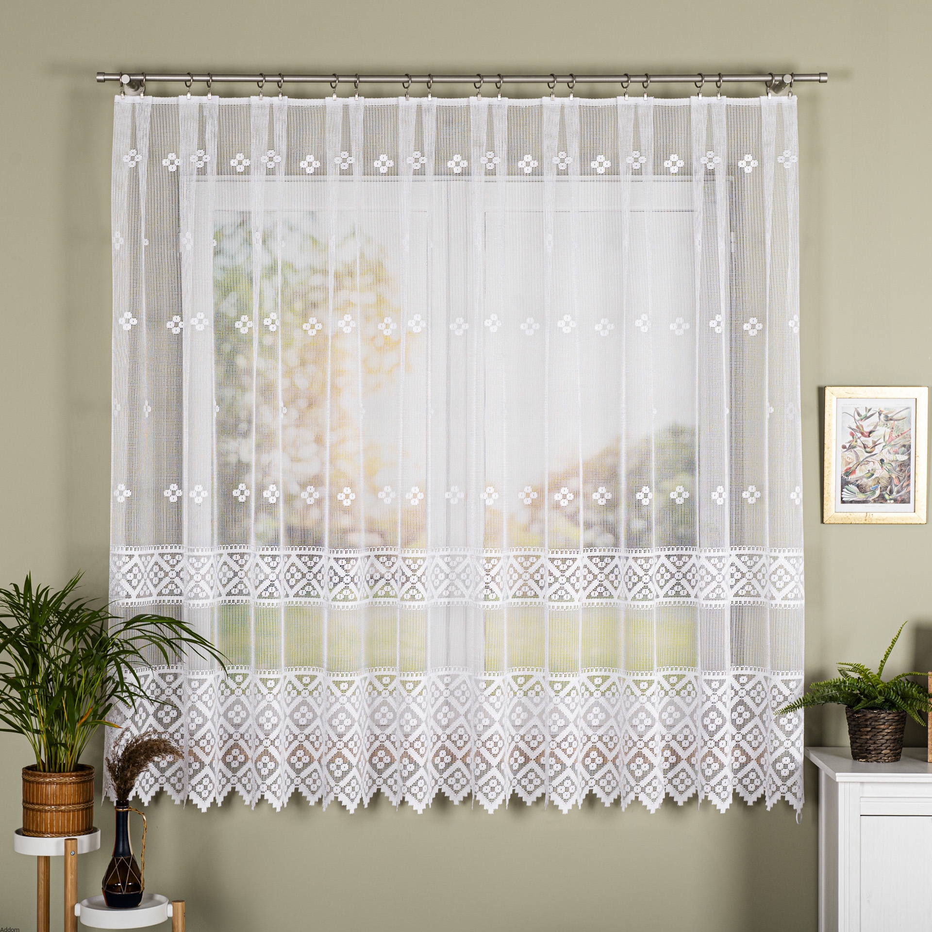 Firany te sprawdzą się zarówno w rustykalnych wnętrzach, jak i uniwersalnie urządzonych pomieszczeniach, i stanowić będą idealne uzupełnienie stylizacji po zawieszeniu ich na oknach. Firana jest oferowana w 3 wysokościach.