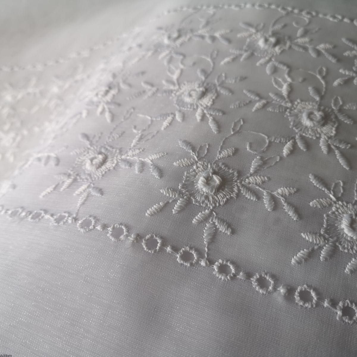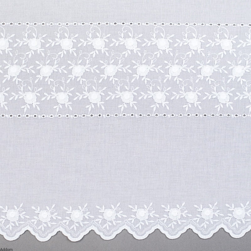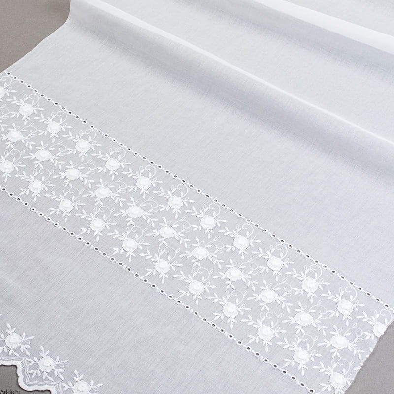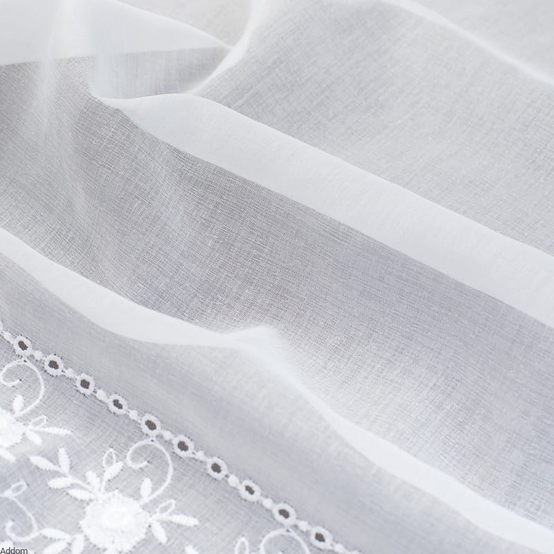 Niesamowite firany z batystu - tkaniny o zwięzłym splocie, przypominającej jedwabne materiały, na których wyhaftowano poziomo kwiaty różyczek. Kwiaty są haftowane tak, że ich obrys wystaje z tkaniny, przez co są bardzo wyraziste. Na pewno jest to dość niespotykany model, dzięki zastosowanemu podkładowi, bogactwo wzoru przyciąga uwagę, a kwiatowy wzór sprawia wrażenie wyższego pomieszczenia. Dodatkową dekoracją jest haft mereżkowy, dzielący część kwiatową od białego batystu.