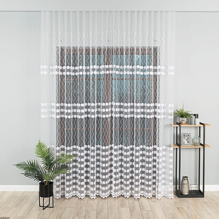 Firanki z przejrzystej siateczki, dołem posiada szeroki pas wykonany z haftowanych kwiatów, które został wyhaftowane białą i opalizującą nicią. Bardzo efektowna firana, z pięknym, grubym i połyskującym haftem, którą nabyć można w wysokości 300 cm. Górą haft jest delikatniejszy, bardziej płaski, pnie się w górę w formie pędów pnączy. Firany są bardzo przejrzyste.