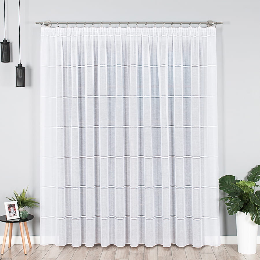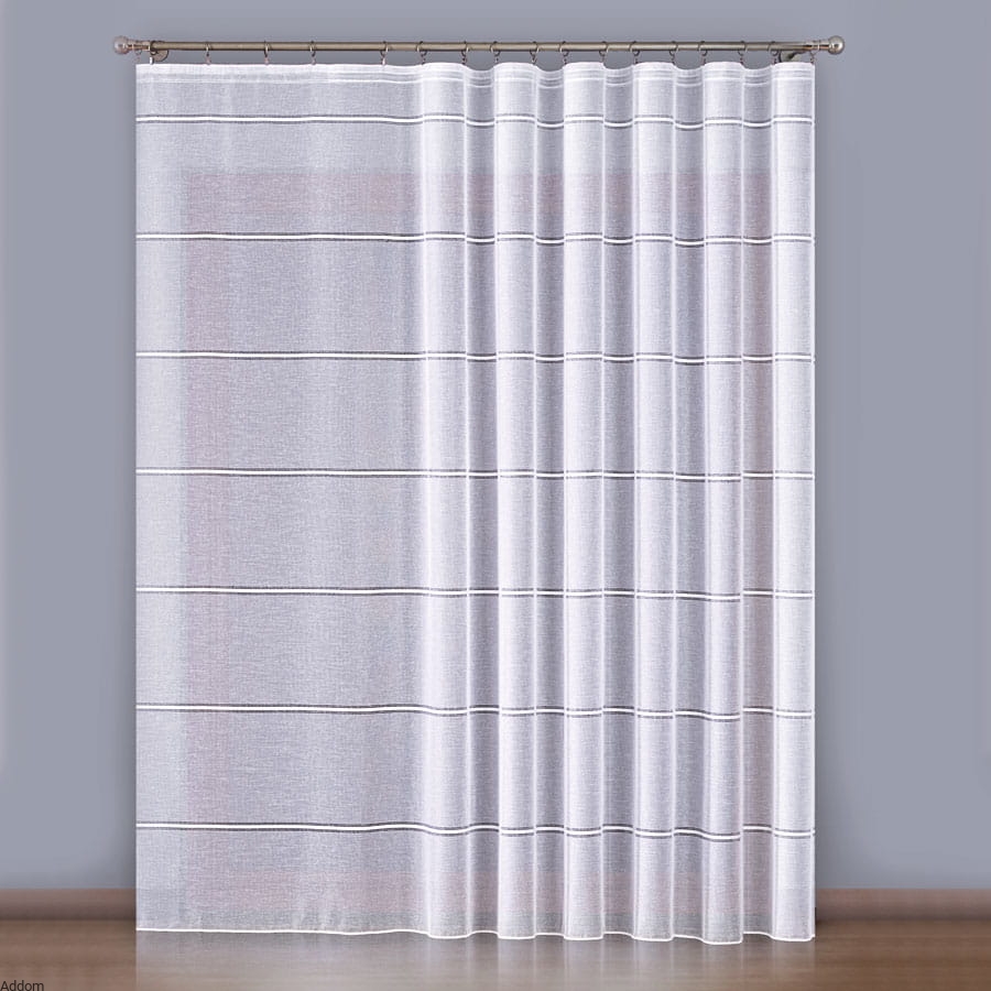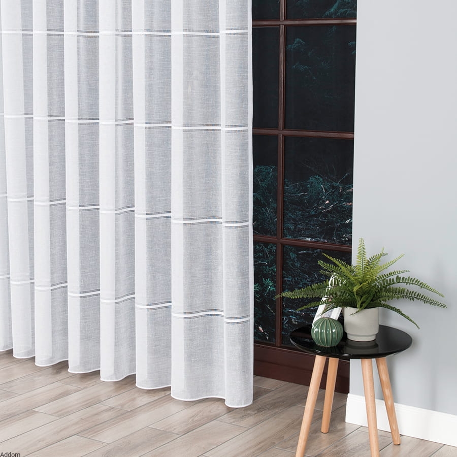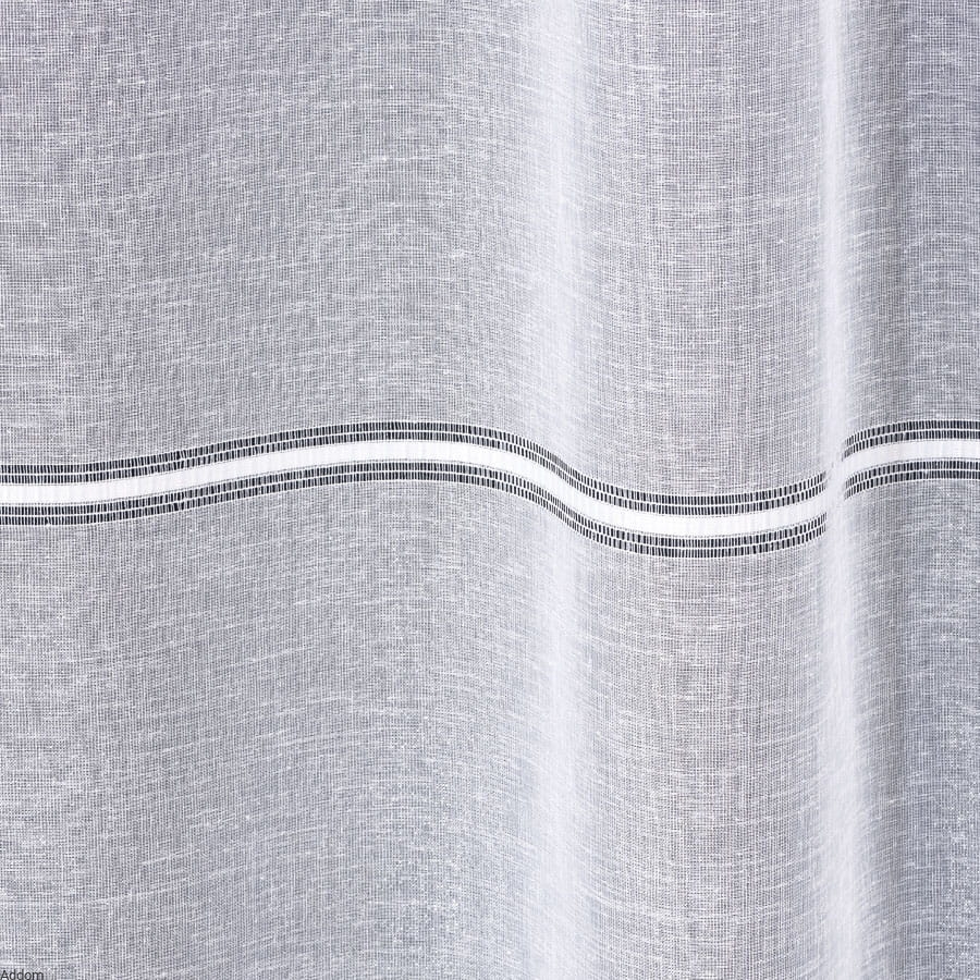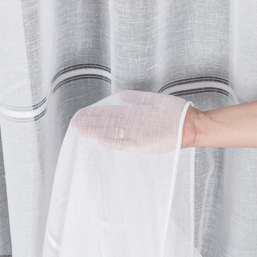 Firany z grubej tkaniny o lnianym wyglądzie, o strukturze lnu, ale o ładnym połysku, sprzedawane na metry. Tkanina stylizowana na len zdobiony haftem mereżkowym, w formie cienkich pasów mereżki w regularnych odstępach, rozmieszczone na całej wysokości firany, która wynosi 300 cm. Paseczki powtarzają się co 32 centymetry i mają 2,5 cm szerokości.