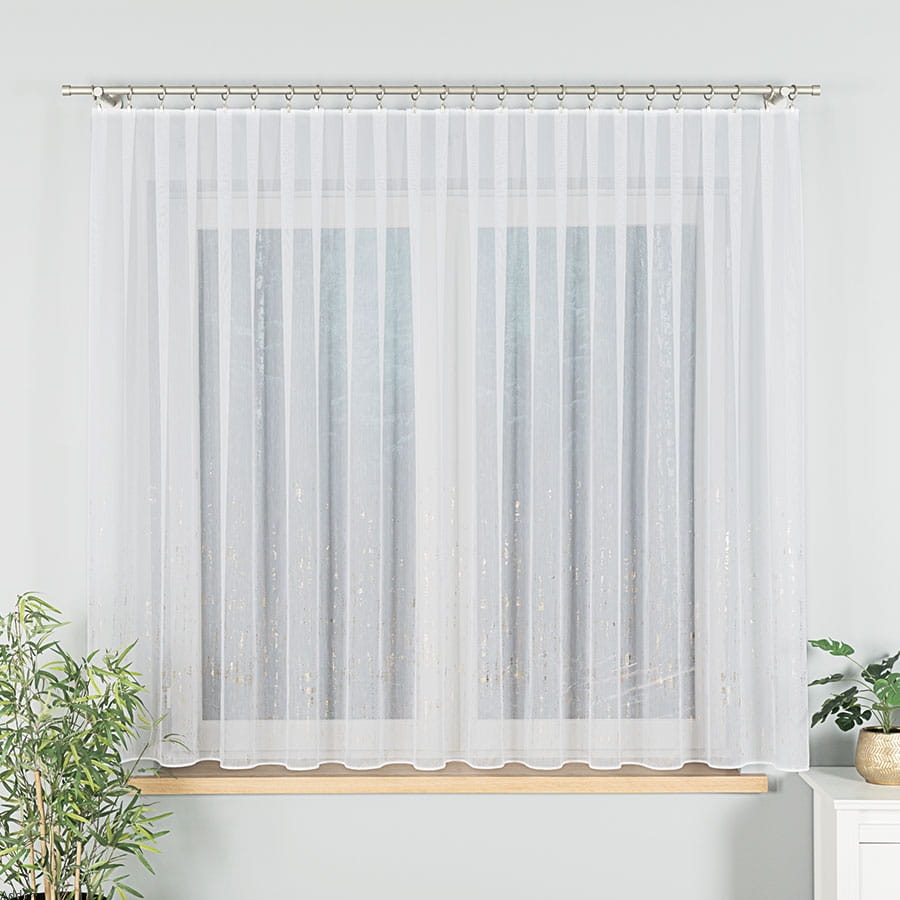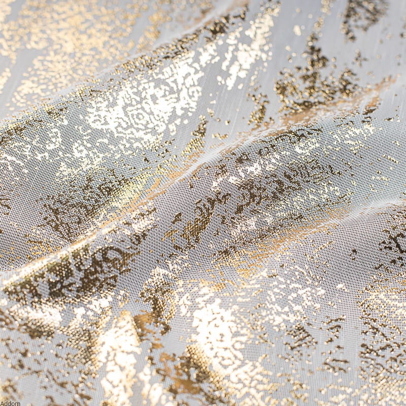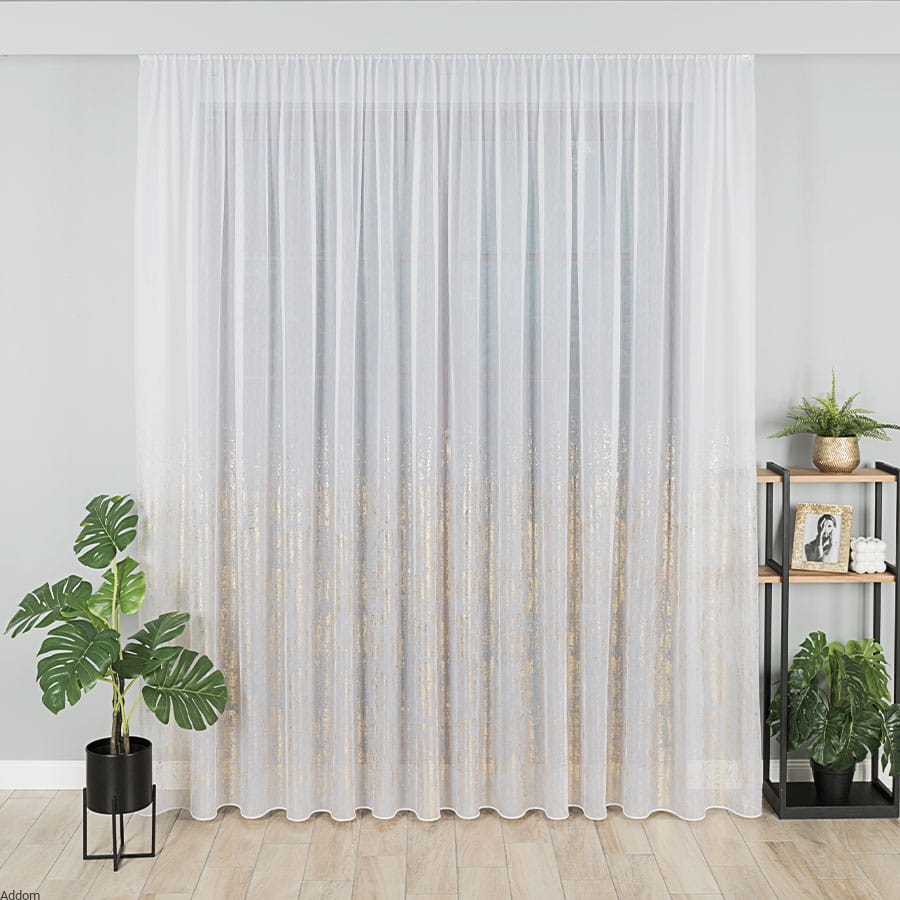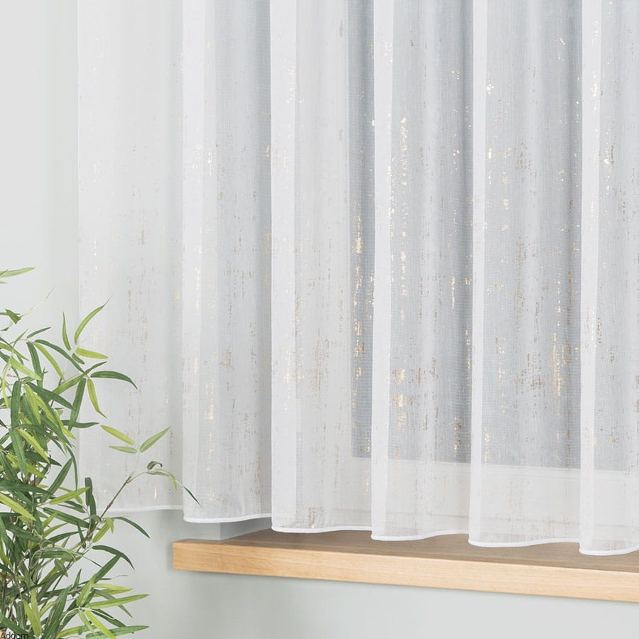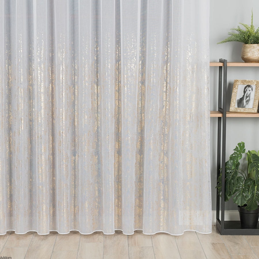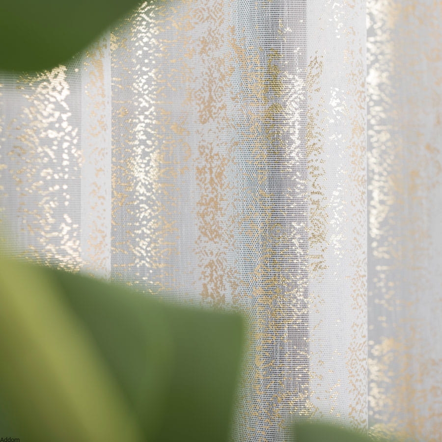 Firany fantazyjne, dekorowane złotem, wyglądające jak nakrapiane nim, o wysokości 315 cm, z ołowianką. Złota dekoracja sięga prawie do połowy wysokości, konkretnie kończy się na wysokości 130 cm od dolnej linii firany, jest nieregularna i wygląda naturalnie. Tło jest białe, stanowi je zagęszczana siatka o niewielkich oczkach.