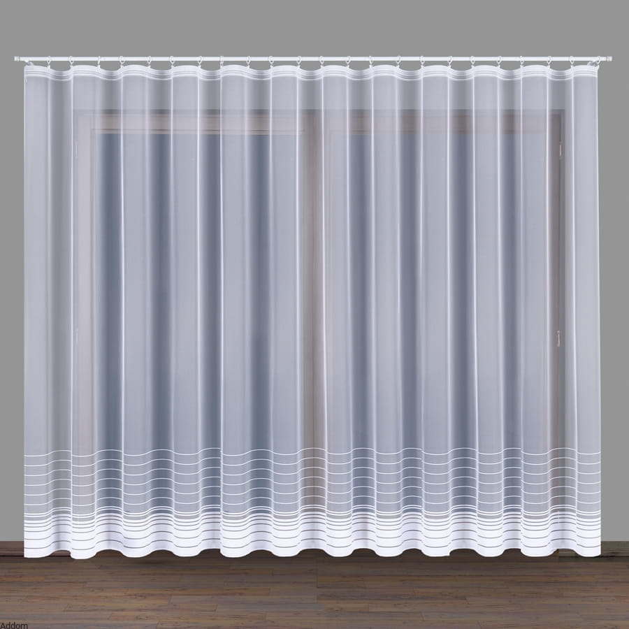 Firany metrażowe z ołowianką, markizeta w paseczki cienkie umieszczone dołem firany, a na samym dole znajdują się trzy szersze pasy, w ostatni pas wszyta jest obciążająca ołowianka, zaszyta białym sznureczkiem. Firany są subtelne, do nowoczesnych wnętrz, cechuje je minimalizm oraz dobra cena jak na firany z ołowianką.