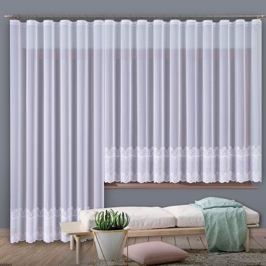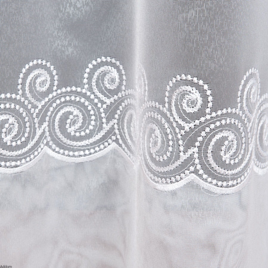 Firany o dekoracyjnym, podwiniętym dole, co oznacza, że materiał jest zawinięty w górę, i dół podwójny wygląda jak biały pasek. Dół ten jest ponadto haftowany na wzór fali morskiej, w spiralki tworzące motyw na wzór spienionych delikatnie fal. Haft ten wykonany jest za pomocą punkcików okrągłych, które obok siebie, jeden przy drugim, układają się w ten fantazyjny wzorek.