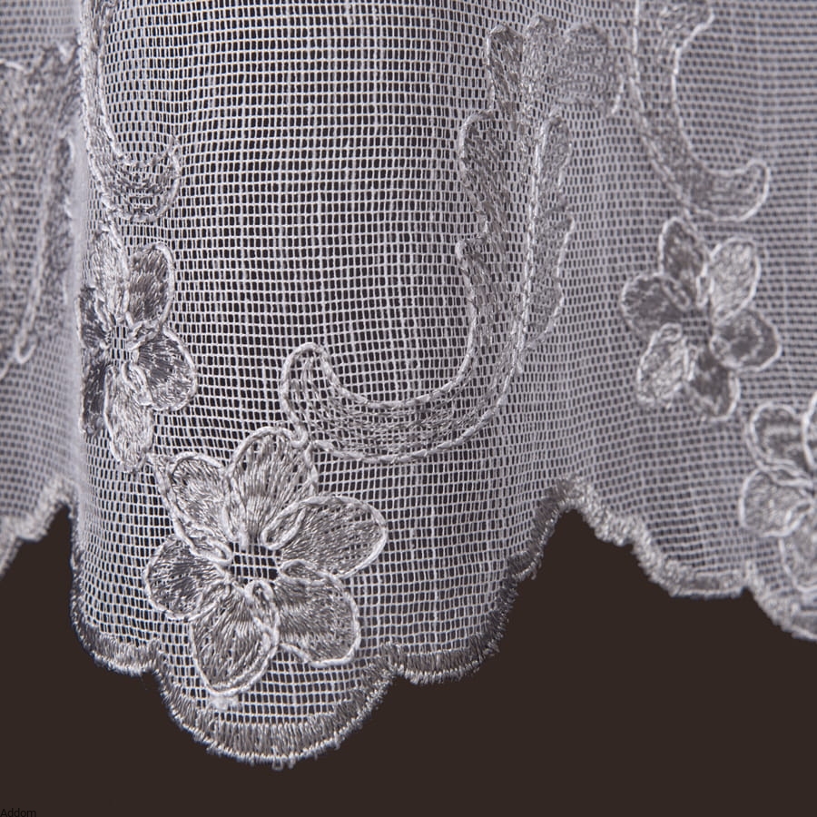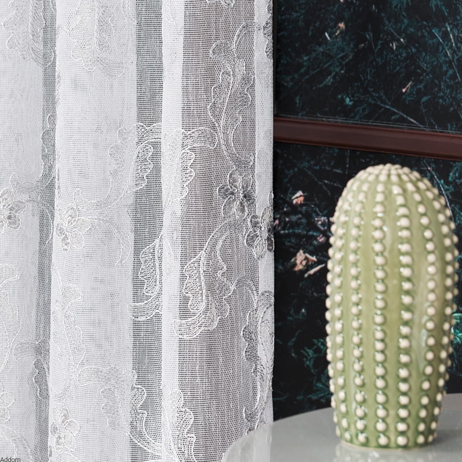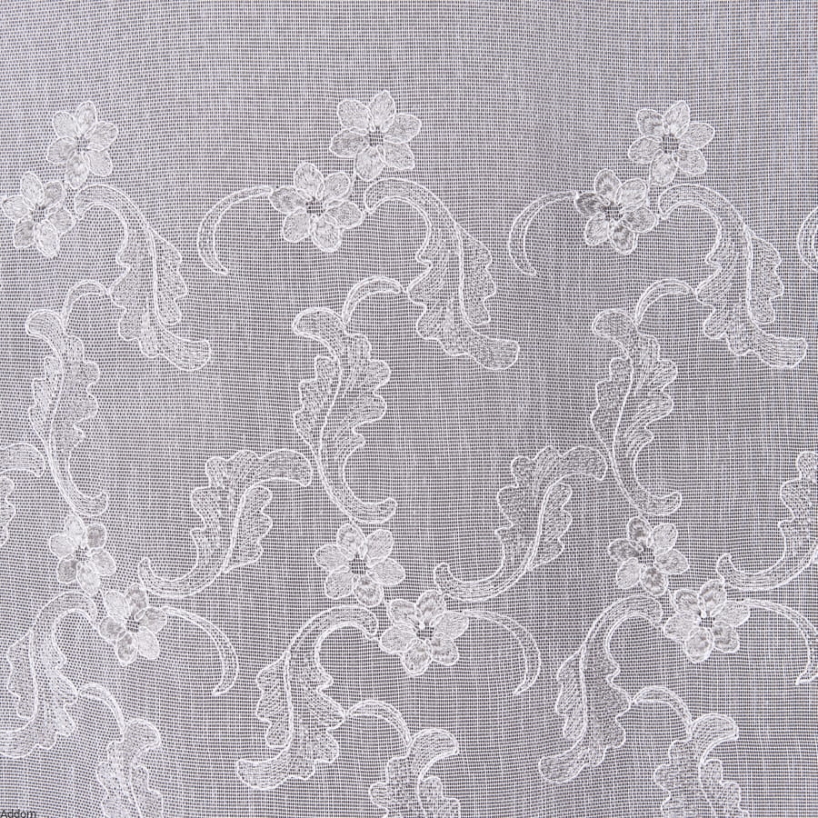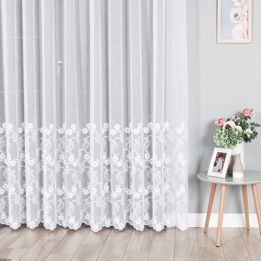 Dolna część firany została ozdobiona gęstym haftem, który tworzy przepiękną kompozycję kwiatów i liści, harmonijnie wpisującą się w klasyczne, rustykalne, prowansalskie, jak i bardziej nowoczesne aranżacje. Wzór haftu został zaprojektowany z dbałością o najdrobniejsze szczegóły – wygląda estetycznie zarówno w świetle dziennym, jak i sztucznym, tworząc subtelne cienie i grę światła.