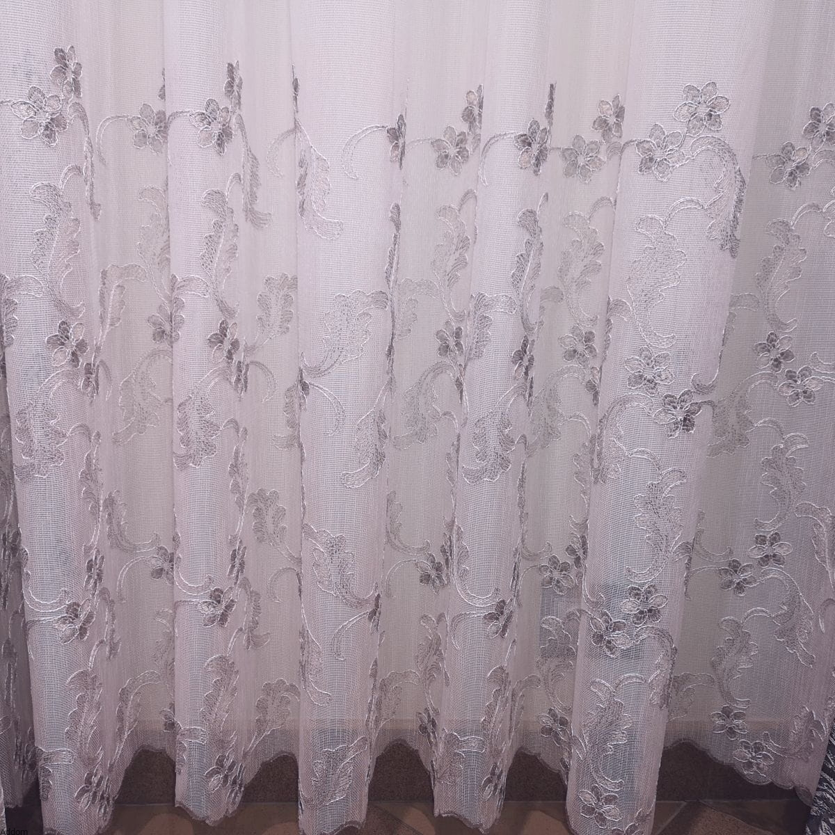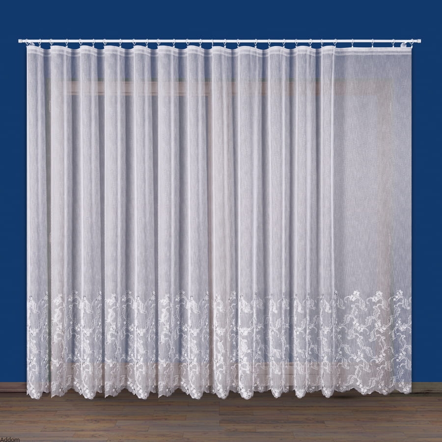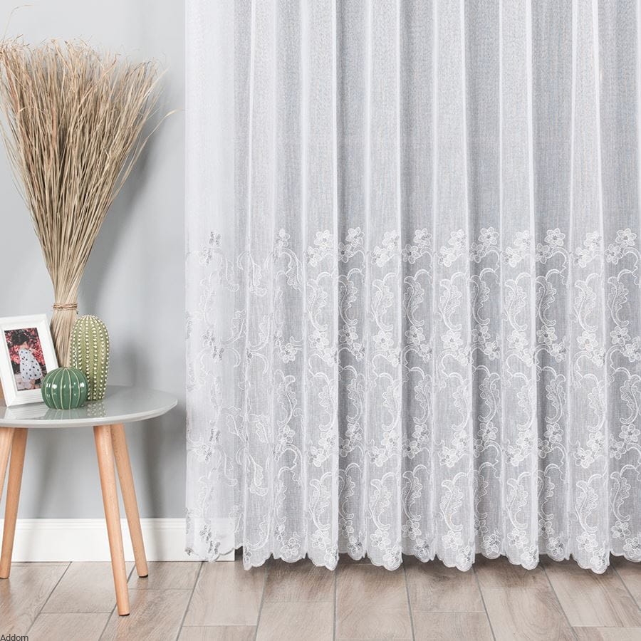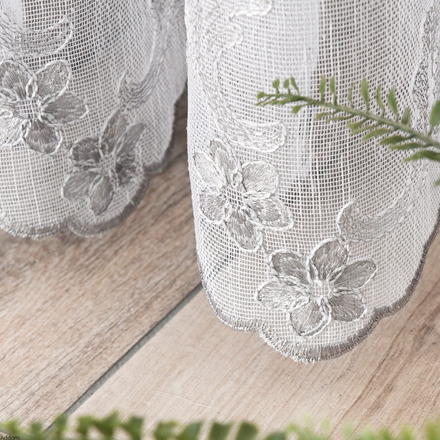 Dolna część firany została ozdobiona gęstym haftem, który tworzy przepiękną kompozycję kwiatów i liści, harmonijnie wpisującą się w klasyczne, rustykalne, prowansalskie, jak i bardziej nowoczesne aranżacje. Wzór haftu został zaprojektowany z dbałością o najdrobniejsze szczegóły – wygląda estetycznie zarówno w świetle dziennym, jak i sztucznym, tworząc subtelne cienie i grę światła.