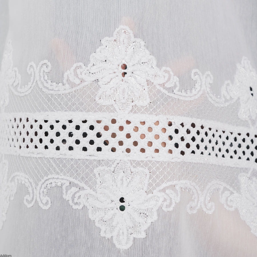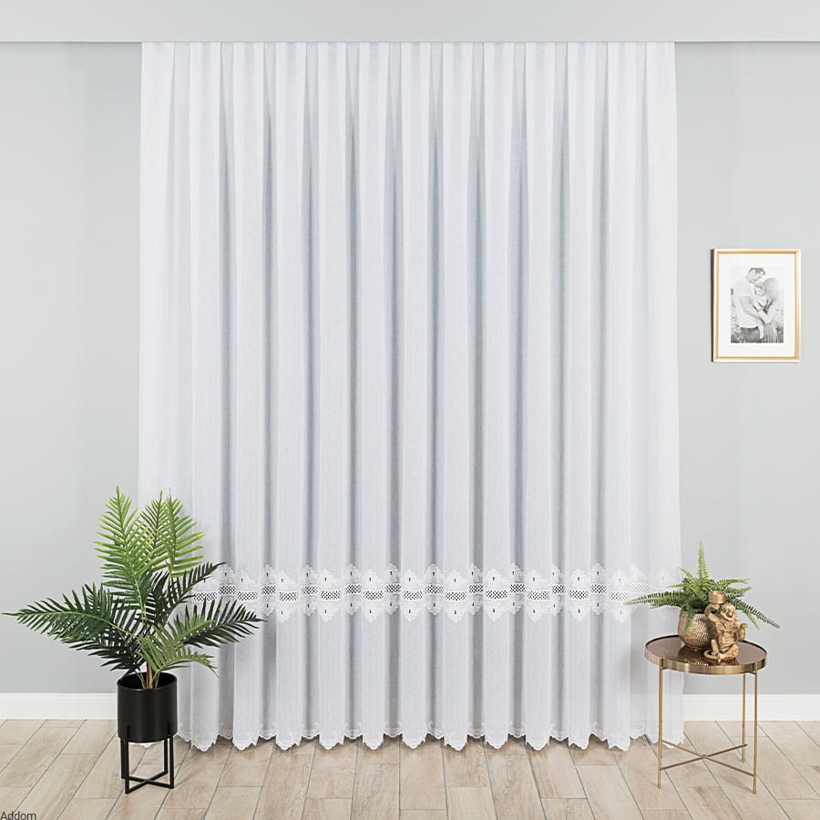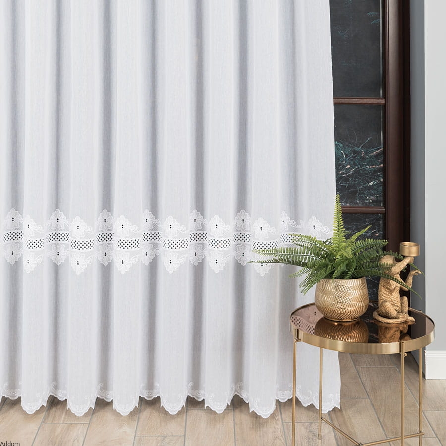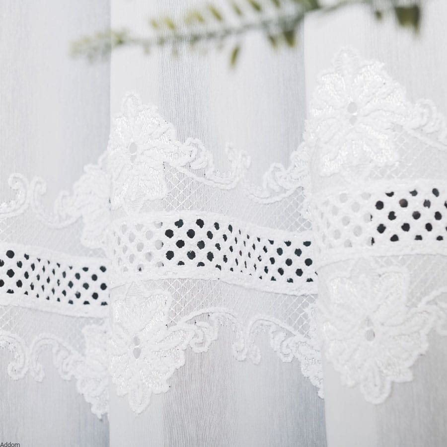 Firanki z tkaniny typu gładziutki, grubszy woal, z pasami poprzecznymi, szerokiego haftu płaskiego z haftem Richelieu, w formie 2 szlaków, zarówno na firanie o wysokości 160 cm jak i 250 cm. Lambrekiny z tym wzorem możecie Państwo przejrzeć w zakładce produktów powiązanych.