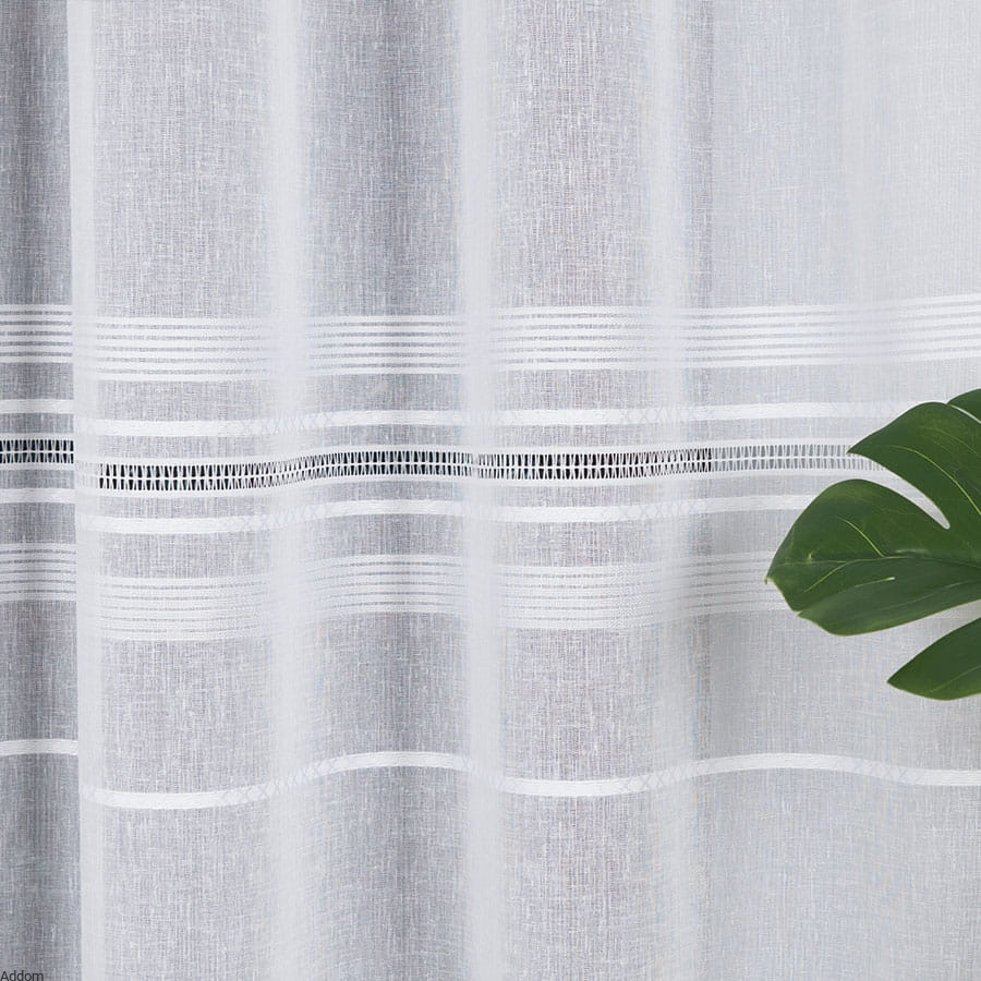 Firany z tkaniny o wyraźnych niciach, o naturalnym wyglądzie, z szeroką dekoracją w formie różnorodnych paseczków, aplikacji i mereżki, o wysokości 330 cm. Firany mają dość naturalny wygląd, ze względu na dekorowane ich misternymi dekoracjami typu mereżka, a dół wykończony ołowianym obciążnikiem.