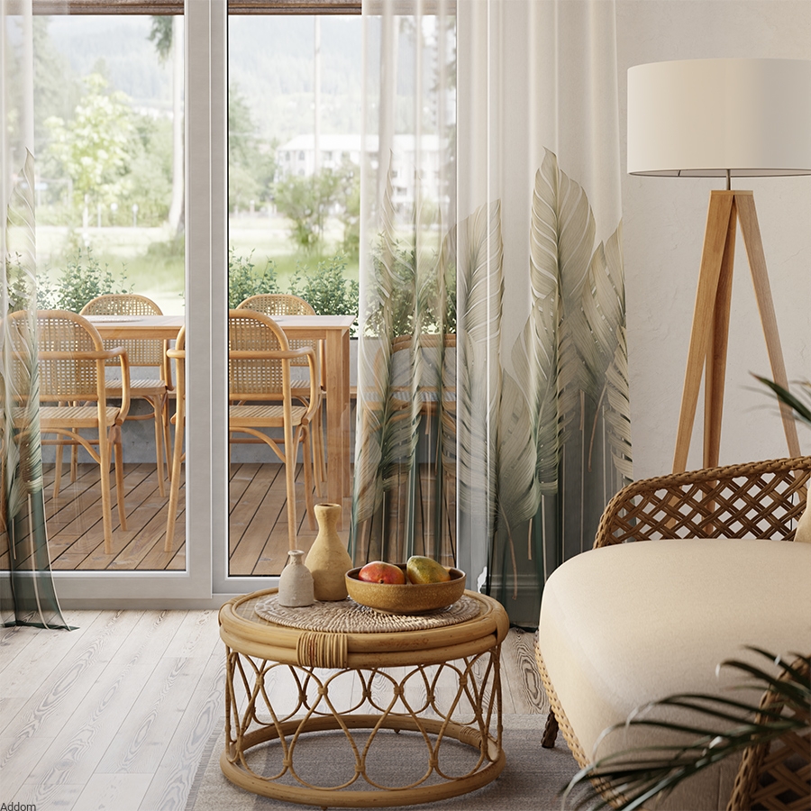 Firany polecane do salonu, z przejrzystego materiału podobnego do woalu - etaminy, z nadrukowanym wzorem w liście palmy. Firany są białe ale przejrzyste, wzór bardzo mocno odznaczający się z tła, zarówno w dotyku jak i z wyglądu, gdyż jest grubszy.