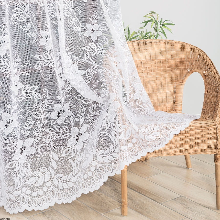 Firana ma tradycyjne, dziurkowane tło, umożliwiające przepływ powietrza, a nić jest grubsza i matowa. Można zakupić dowolną ilość metrów, gdyż są to firany sprzedawane z metra.