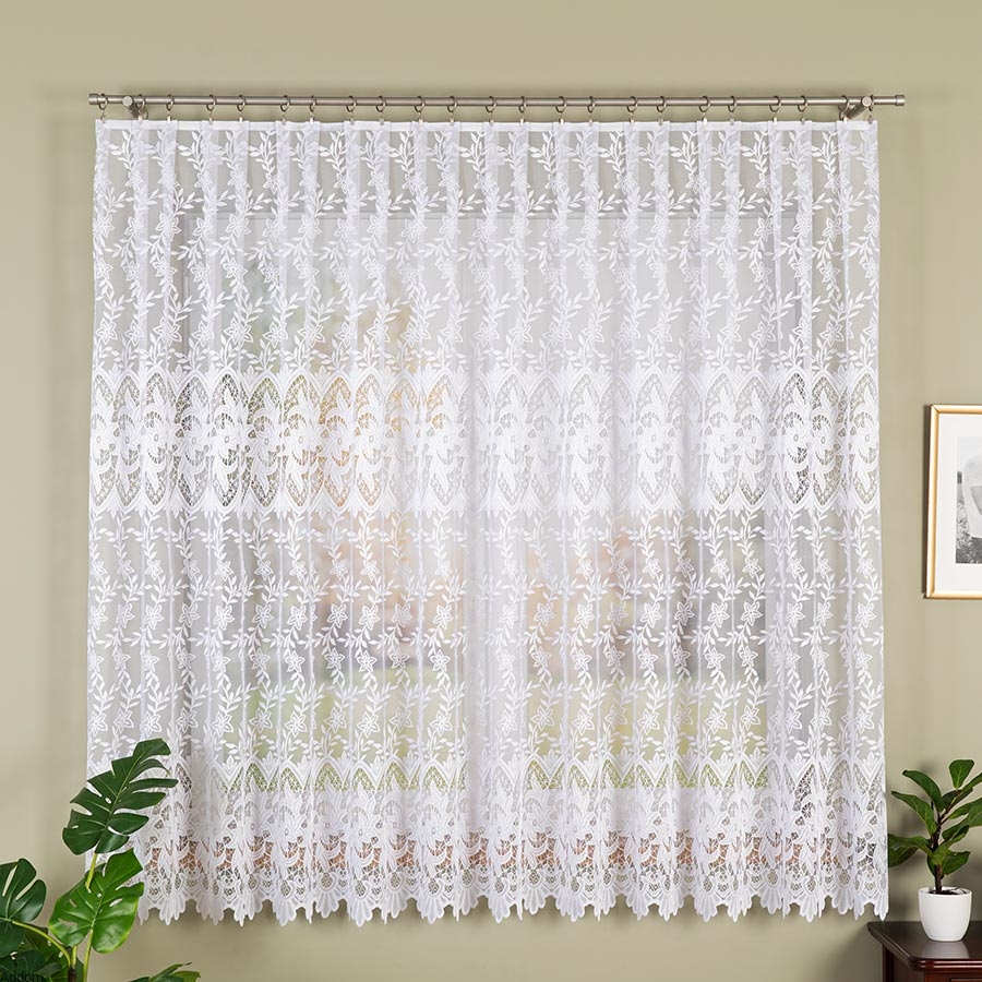 Firanki oferowane w 3 rozmiarach, jako krótkie na 160 cm, 170 cm i długie 250 cm, z których uszyć można widoczne na zdjęciu firany cy komplet balkonowy. Firany są żakardowe, o gęstym wzorze pokrywającym całość tła firanek. Jest to model gęsty, dobrze odwracający uwagę, polecany tam, gdzie zbyt dużo dzieje się za oknem i niekoniecznie chcemy na to marnować swoją uwagę. Wzorek tego żakardu to liście i rosnące w górę pięciopłatkowe kwiaty.