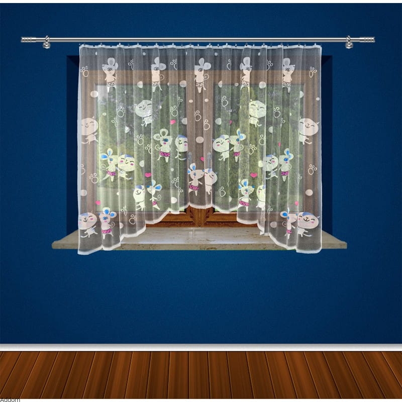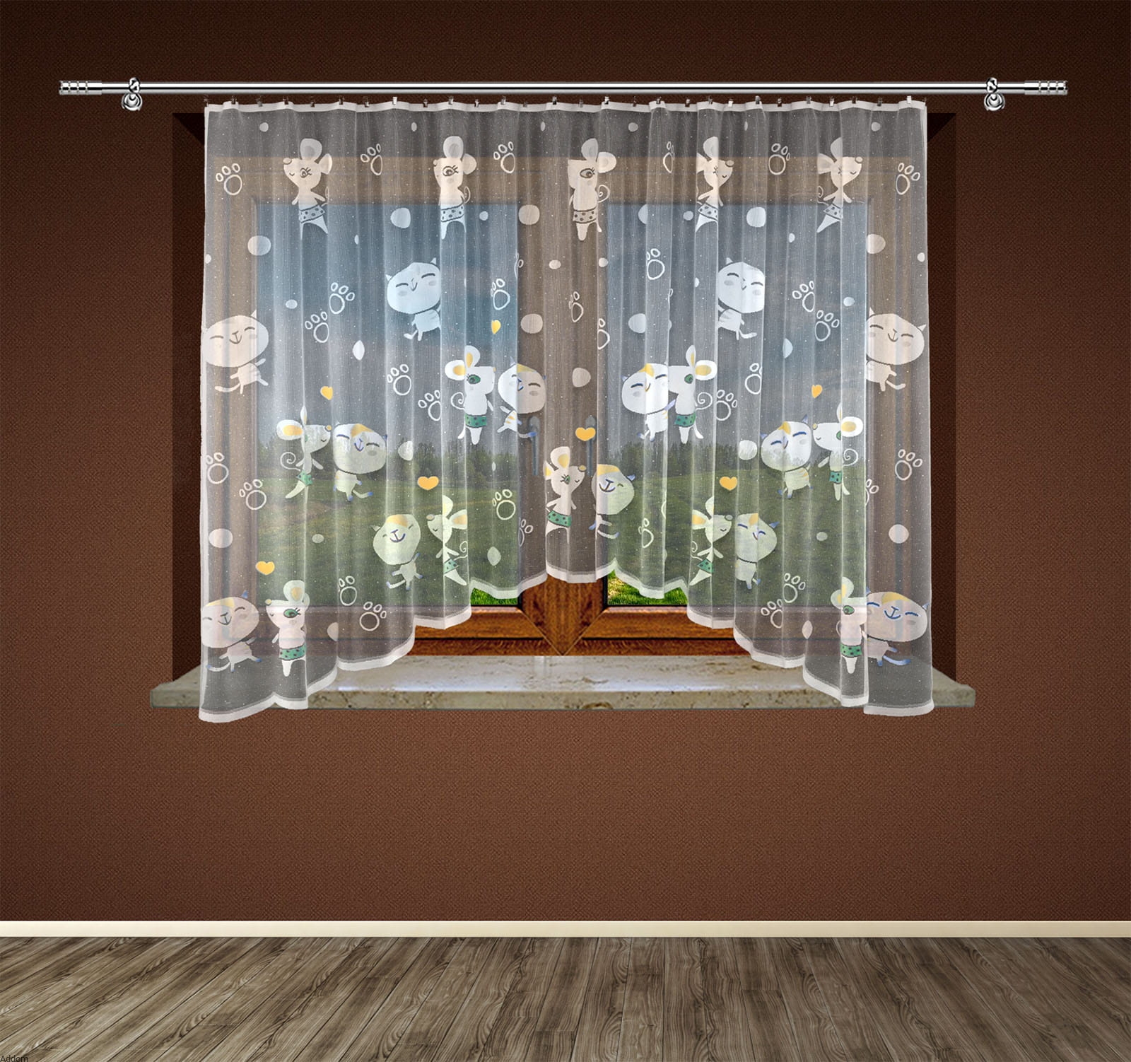 Firanki z dzianiny żakardowej, gotowe do zawieszenia, z wzorami przedstawiającymi słodkie kociaki. Biała, nie wymagająca prasowania firana do pokoików dziecięcych, którą docenią zapracowane mamy. Wymiary przed umarszczeniem 160x300 cm.