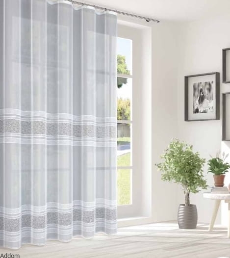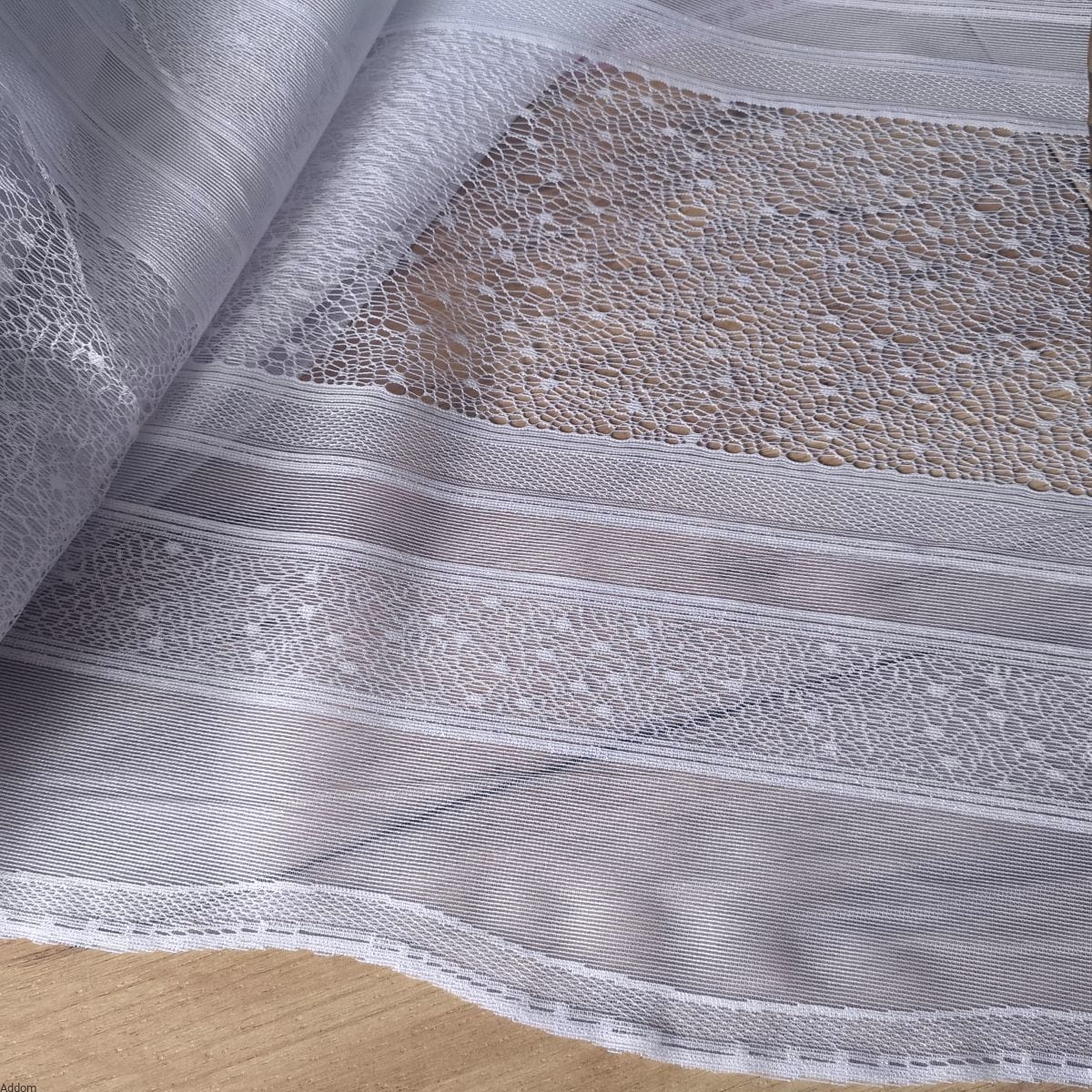 Firany żakardowe w szerokie pasy, które wypełnia ażurowy wzór pajęczynkowy oraz małe, pełne kółeczka, czy plamki, wkomponowane w ten ażur. Główny wzór podkreślony jest wypukłymi, cienkimi paseczkami.