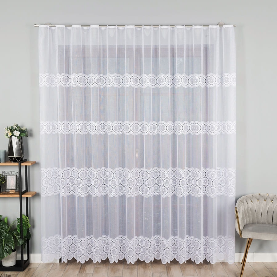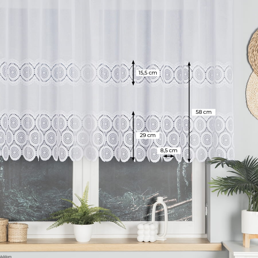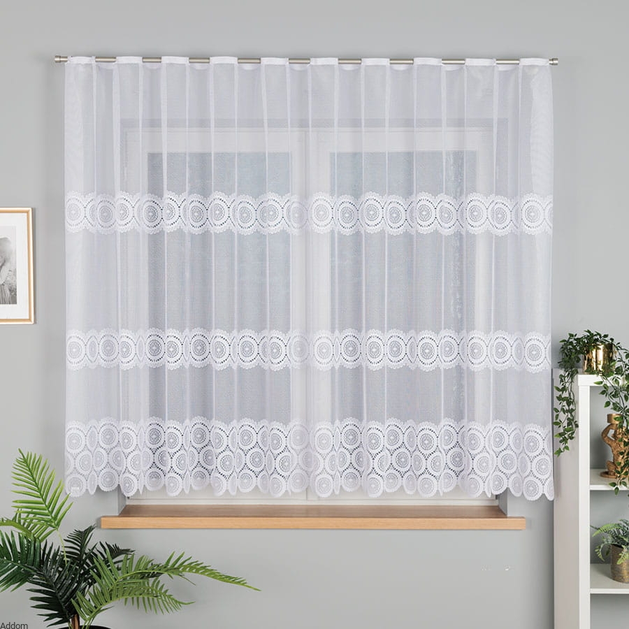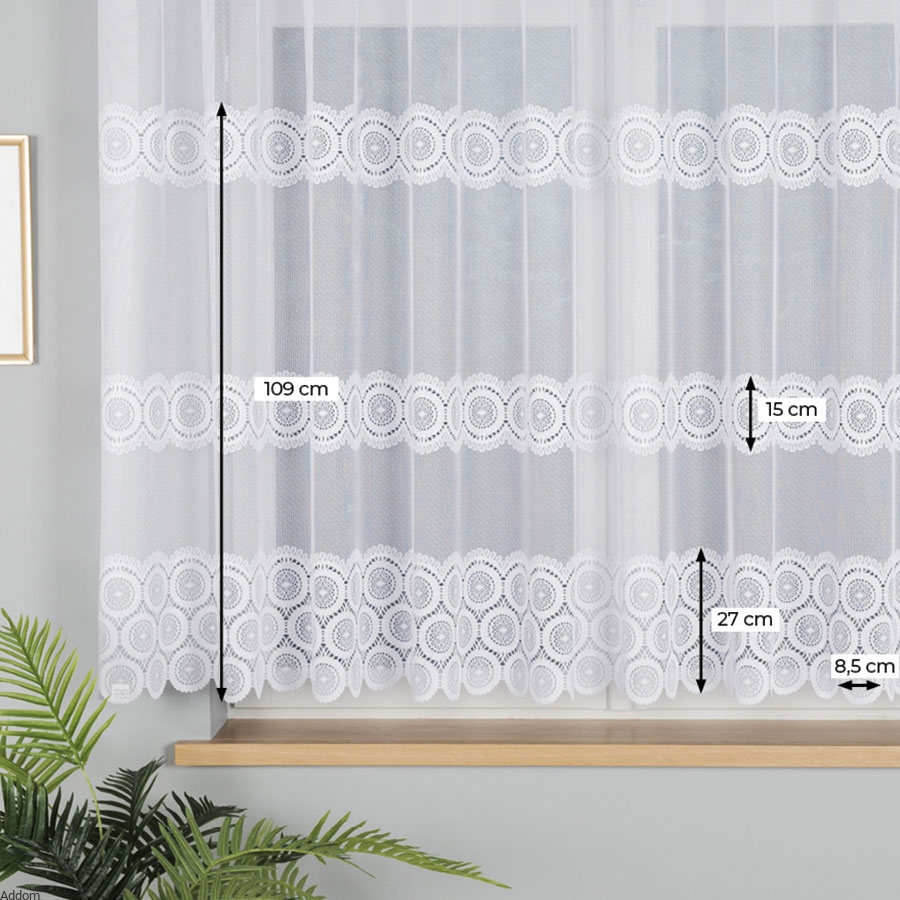 Subtelne firany żakardowe wykonane w technologii żakardu pajęczynkowego, w kółeczka o przejrzystych środkach. Dekoracja o szerokim, potrójnym pasie dołem, złożonym z kółeczek leżących obok siebie wzdłuż brzegu, w 3 rzędach - firany długie, a firanki krótkie mają 2 rzędy kółeczek.