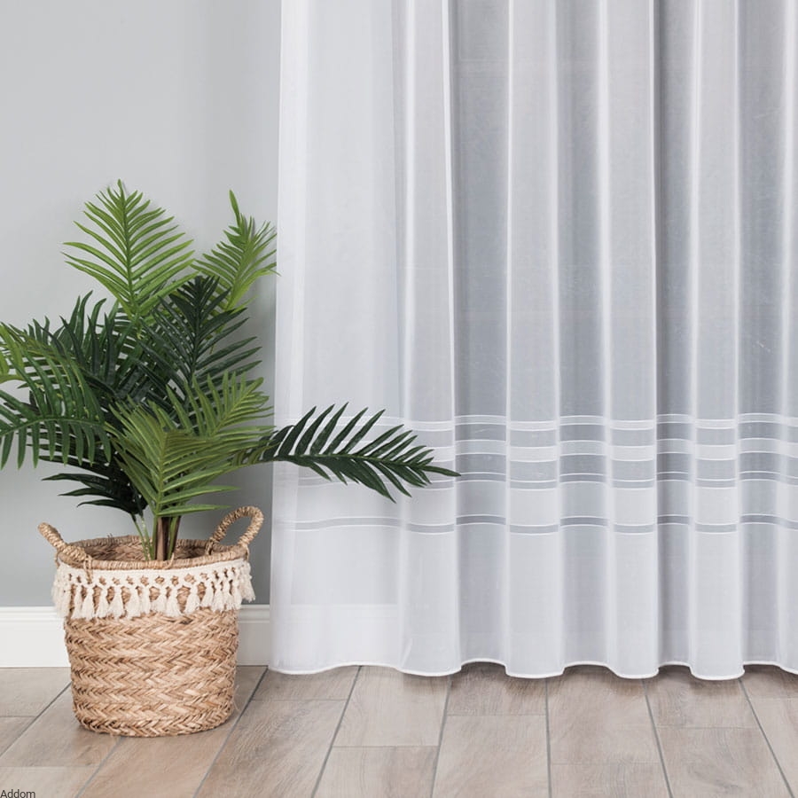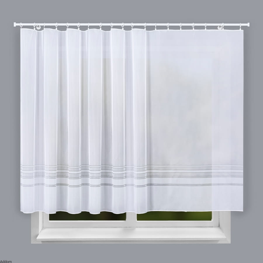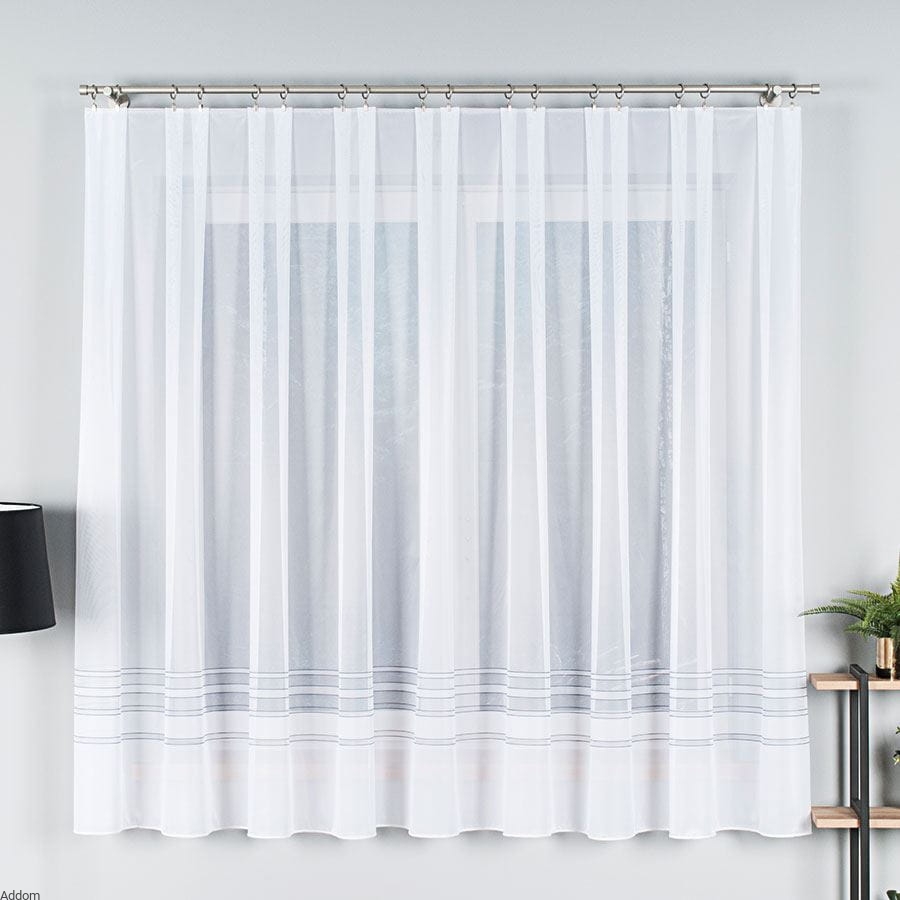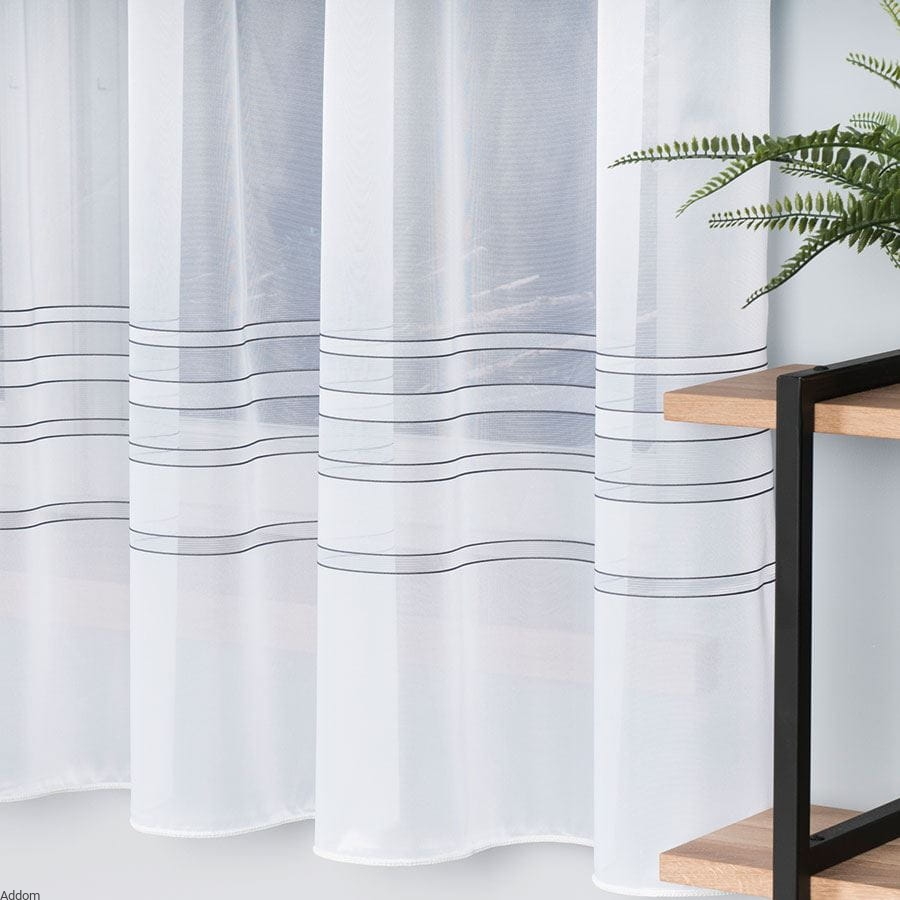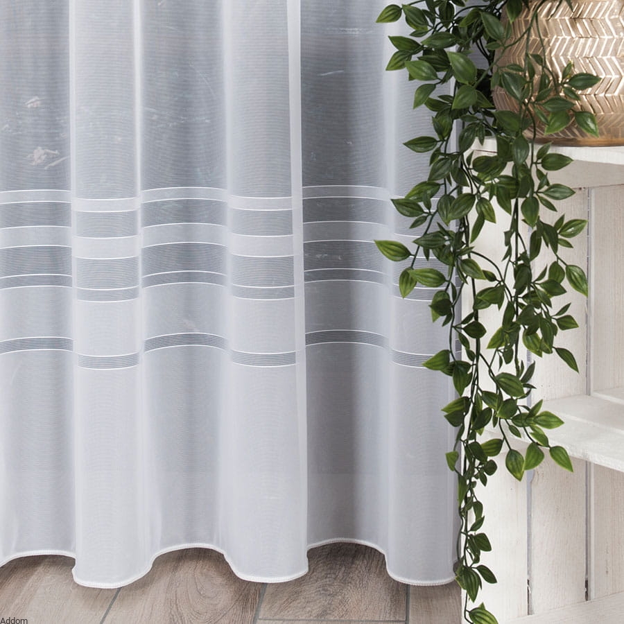 Jest to dość praktyczny żakard, o modnym fasonie w neutralne paseczki, a dzięki szerokiemu wachlarzowi rozmiarów, można z nich uszyć wiele dekoracji na nietypowe okna, w tym okna balkonowe. Ten typ firan oferujemy również w formie firan z łukiem - podkrojem, i są to firany gotowe, które można łączyć w firanami kupowanymi w metrażu a pasy będą zgrywać się po dosunięciu firan do siebie.