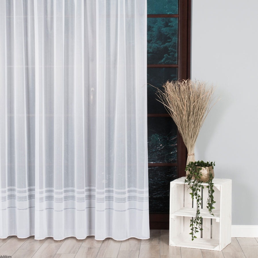Firany o wyglądzie firan tkaninowych, typu gęsty żakard w pasy, węższe i szerokie, które wypełnione są jeszcze większą ilością nici białej, aby bardziej się odznaczać z gęstego tła. Brzegi pasów są wypukłe, a brzeg ten występuje w 2 wariantach - białym i szarym (obie wersje mają różne ceny). Dół wykończony jest białym, szerokim pasem. Dołem znajduje się obciążnik - ołowianka.