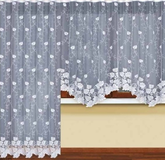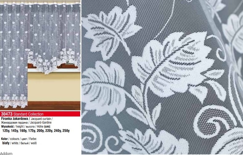 Firany żakardowe proste dołem lub wykończone falą, z gęstym wzorem w liście dołem, górą kontynuacja w formie pnących się wysoko roślin. Tło jest subtelne, przejrzyste, a wzór wyrazisty.