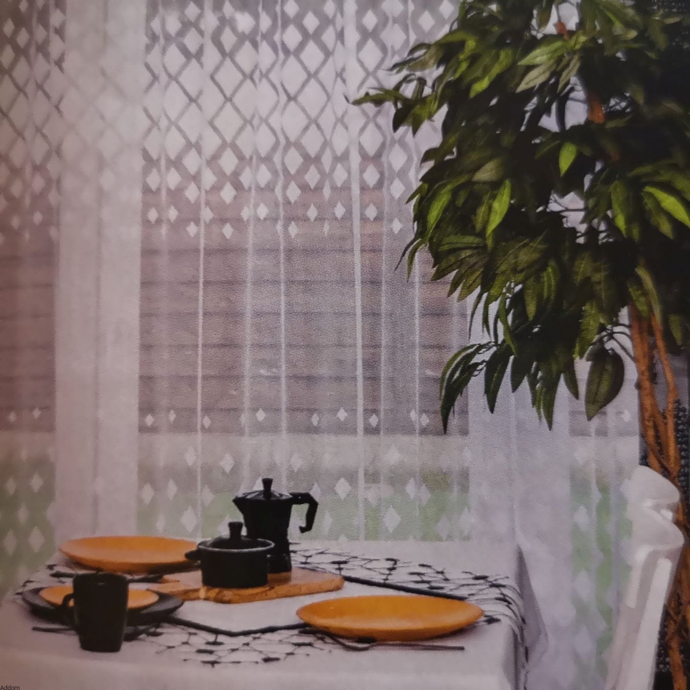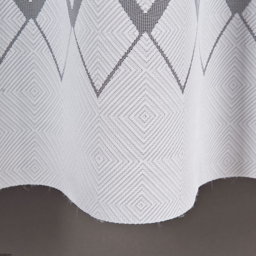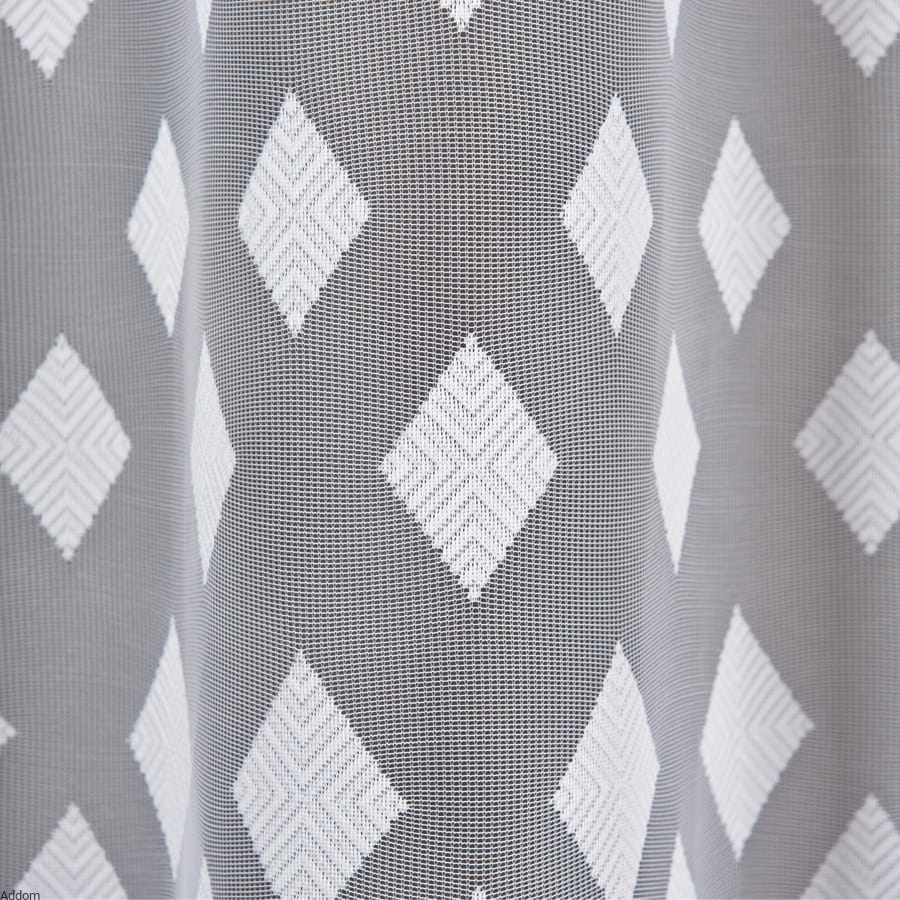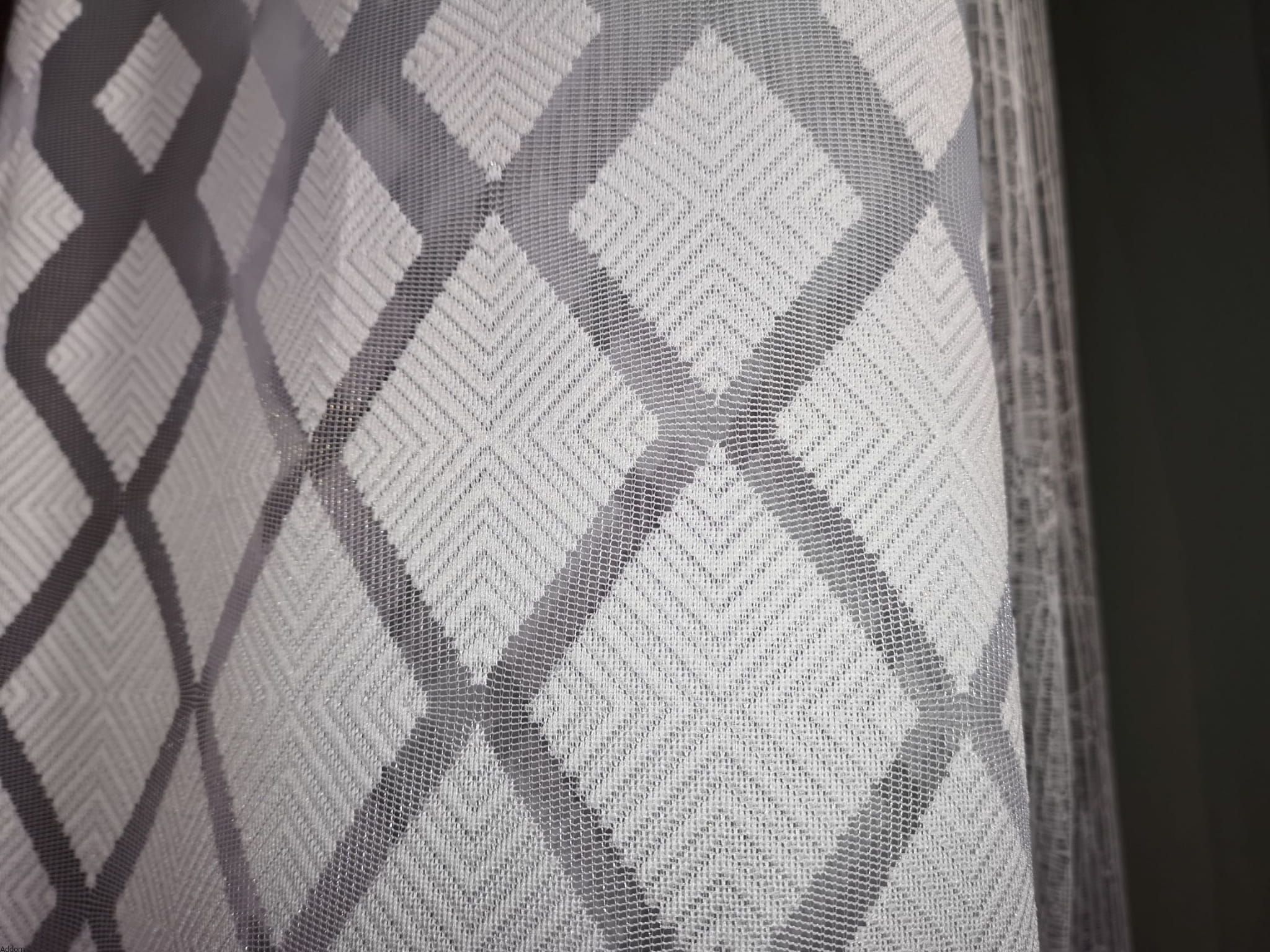 Firany w romby, które tworzą szerokie pasy, złożone z mniejszych i większych rombów, w środkowej oraz dolnej części długiej firany, lub od dołu do połowy firan krótkich. Tło przejrzyste, a romby bardzo grube, ze ściśle układanej nitki, a co ciekawe, na białej części wzorów znajduje się jeszcze jeden wzór w romby. Można to zobaczyć na zbliżeniu wzorów, na załączonych do produktu zdjęciach.