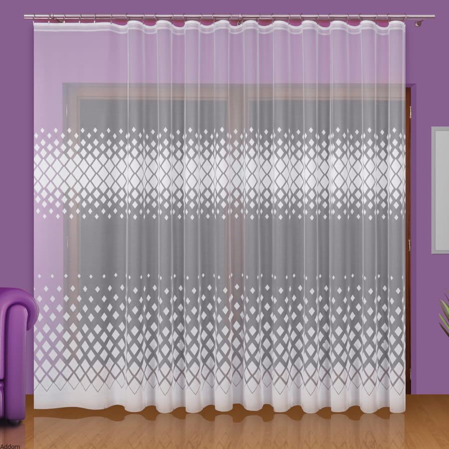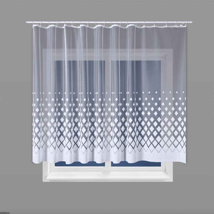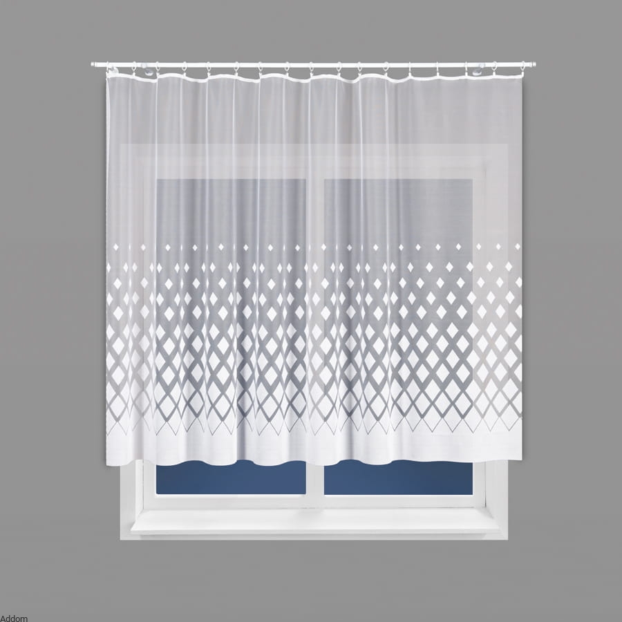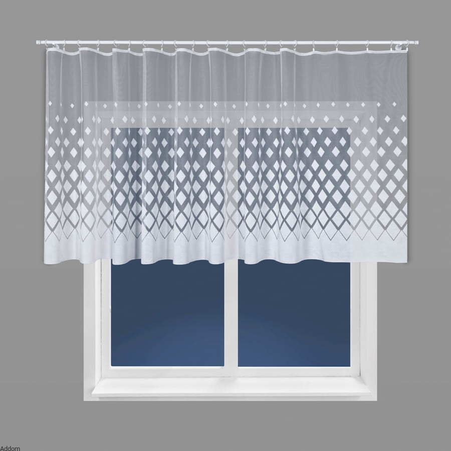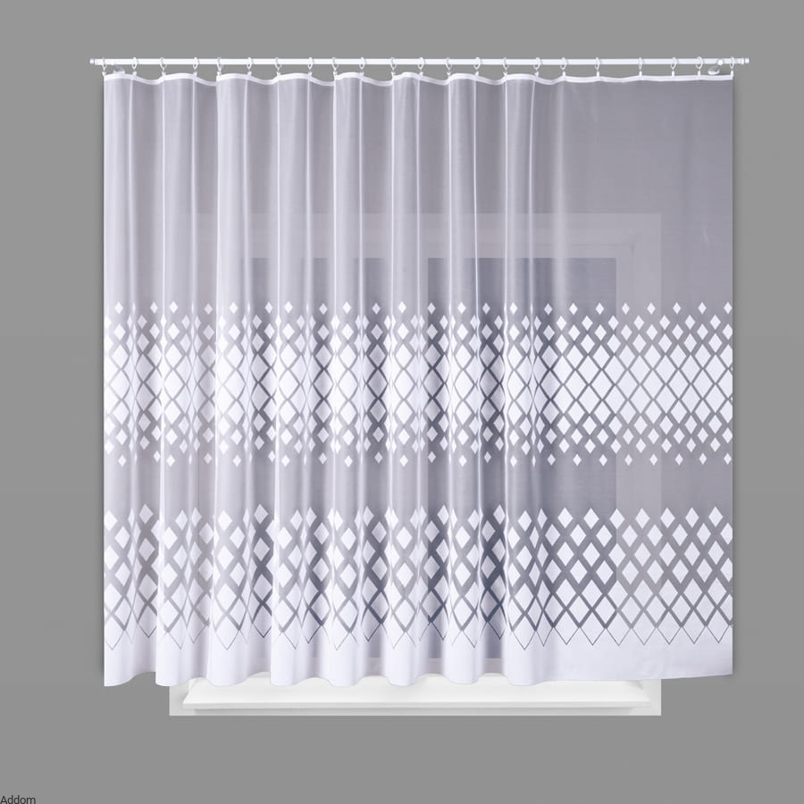 Firany w romby, które tworzą szerokie pasy, złożone z mniejszych i większych rombów, w środkowej oraz dolnej części długiej firany, lub od dołu do połowy firan krótkich. Tło przejrzyste, a romby bardzo grube, ze ściśle układanej nitki, a co ciekawe, na białej części wzorów znajduje się jeszcze jeden wzór w romby. Można to zobaczyć na zbliżeniu wzorów, na załączonych do produktu zdjęciach.