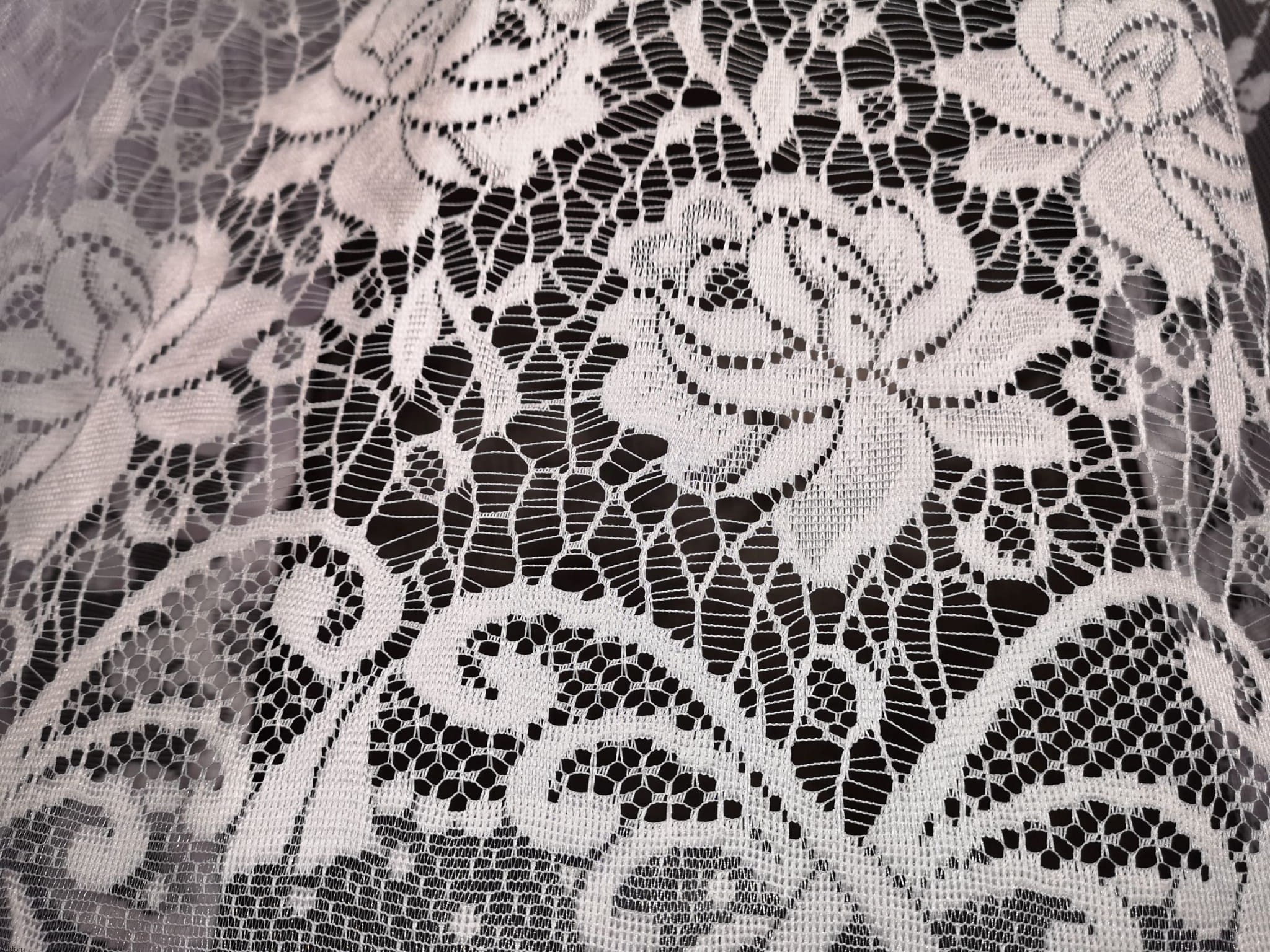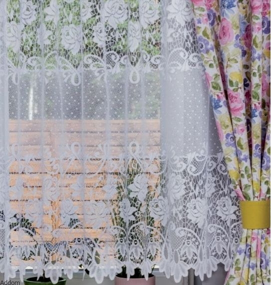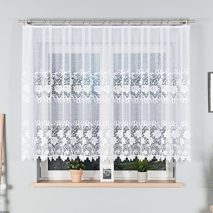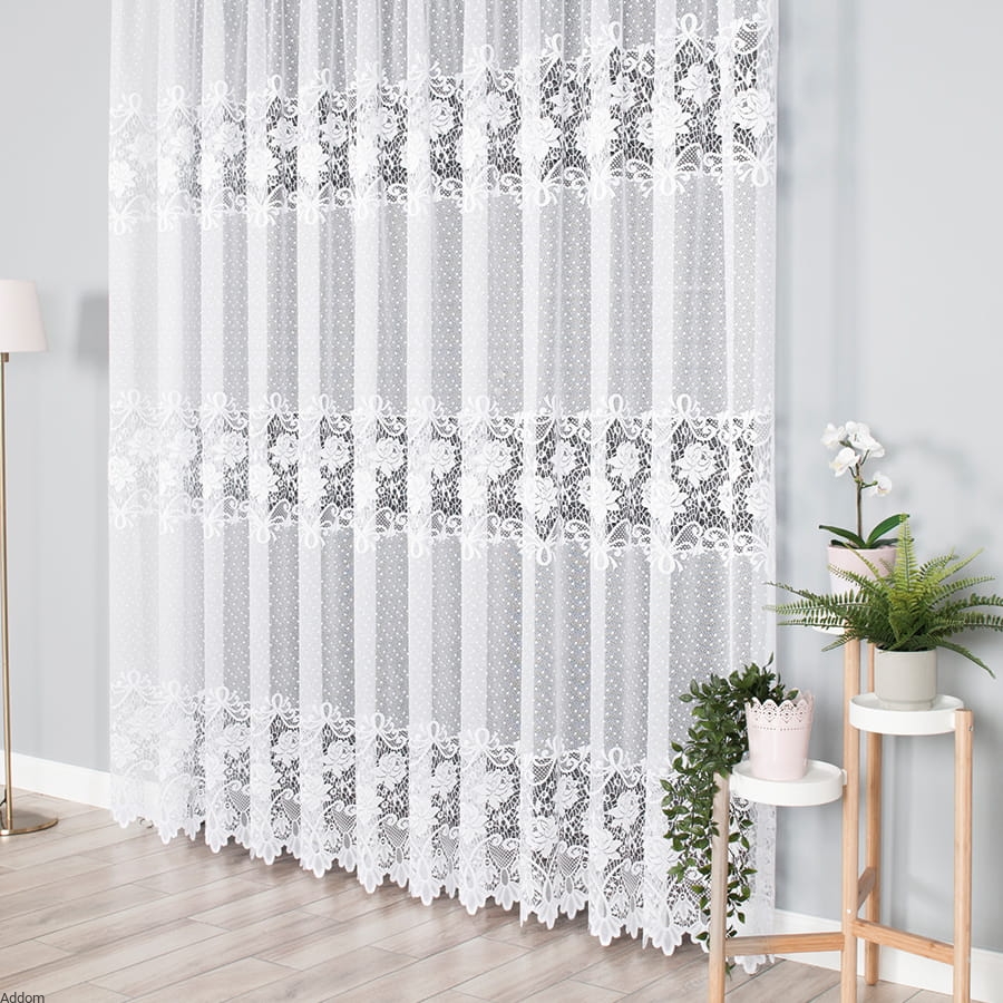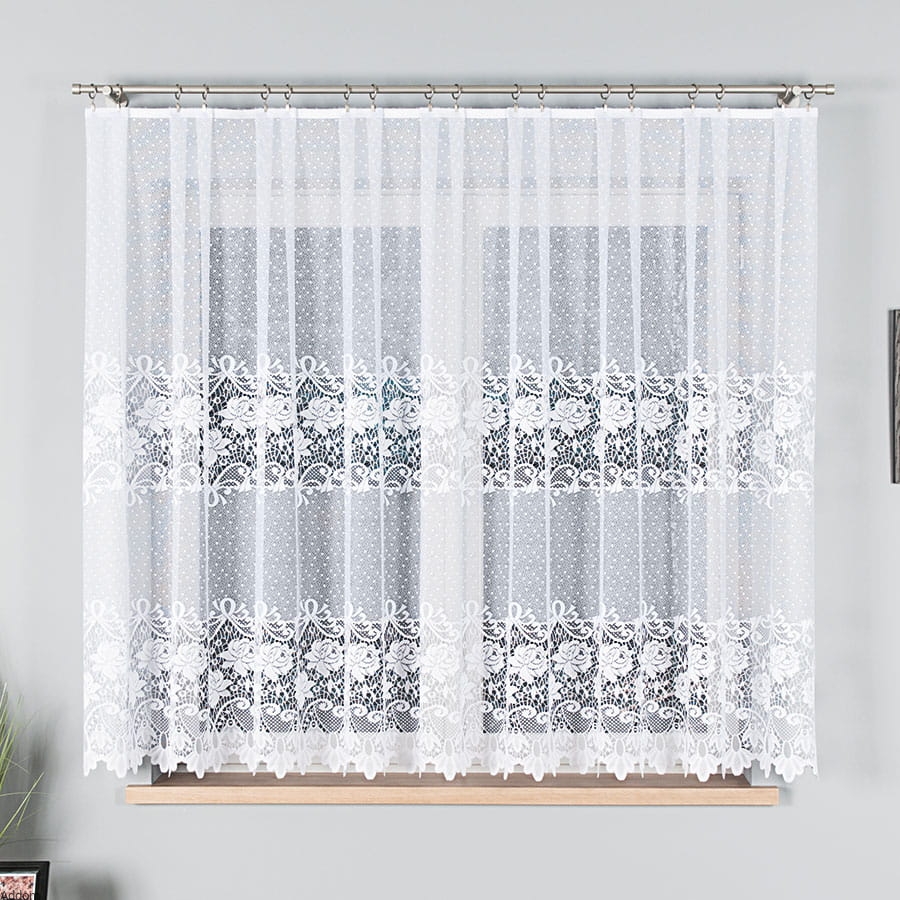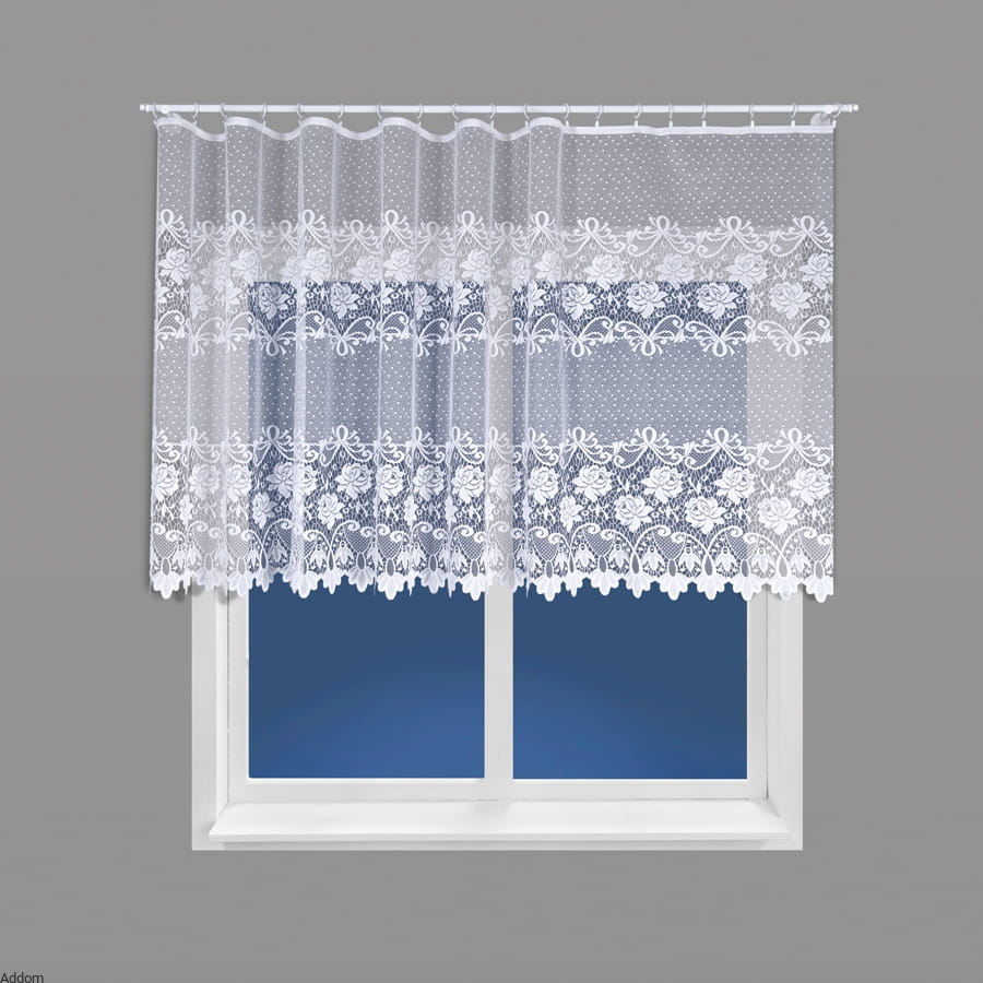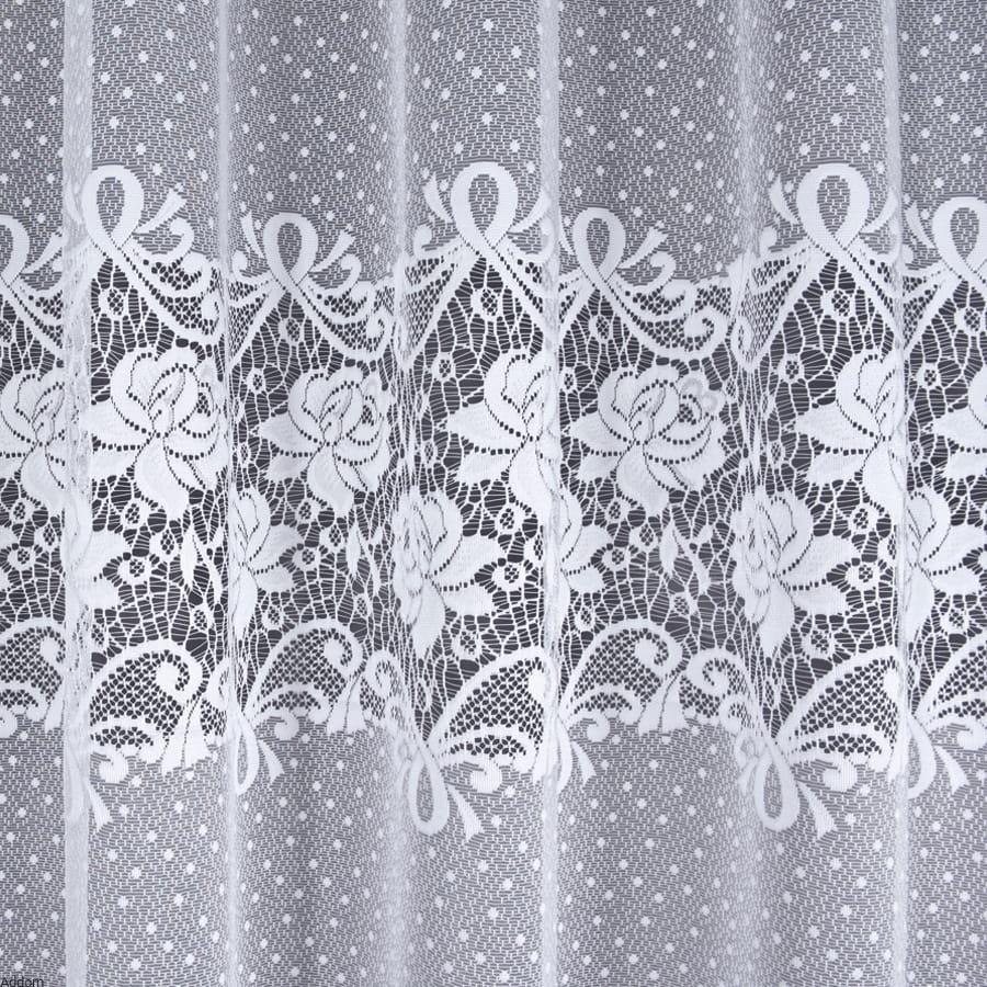 Firany w róże, żakardowe, mające w zależności od wysokości aż 3 pasy szerokie z dekoracjami róż w wersji na 250 cm, i 2 pasami w niższych wersjach firan. Tło firanek jest w kropeczki, natomiast w miejscu, gdzie łączy się ono z pasami, umieszczono wzór wstążeczki, aby sprawiać wrażenie, że wzór jest wkomponowany w tło na wzór firan szytych.