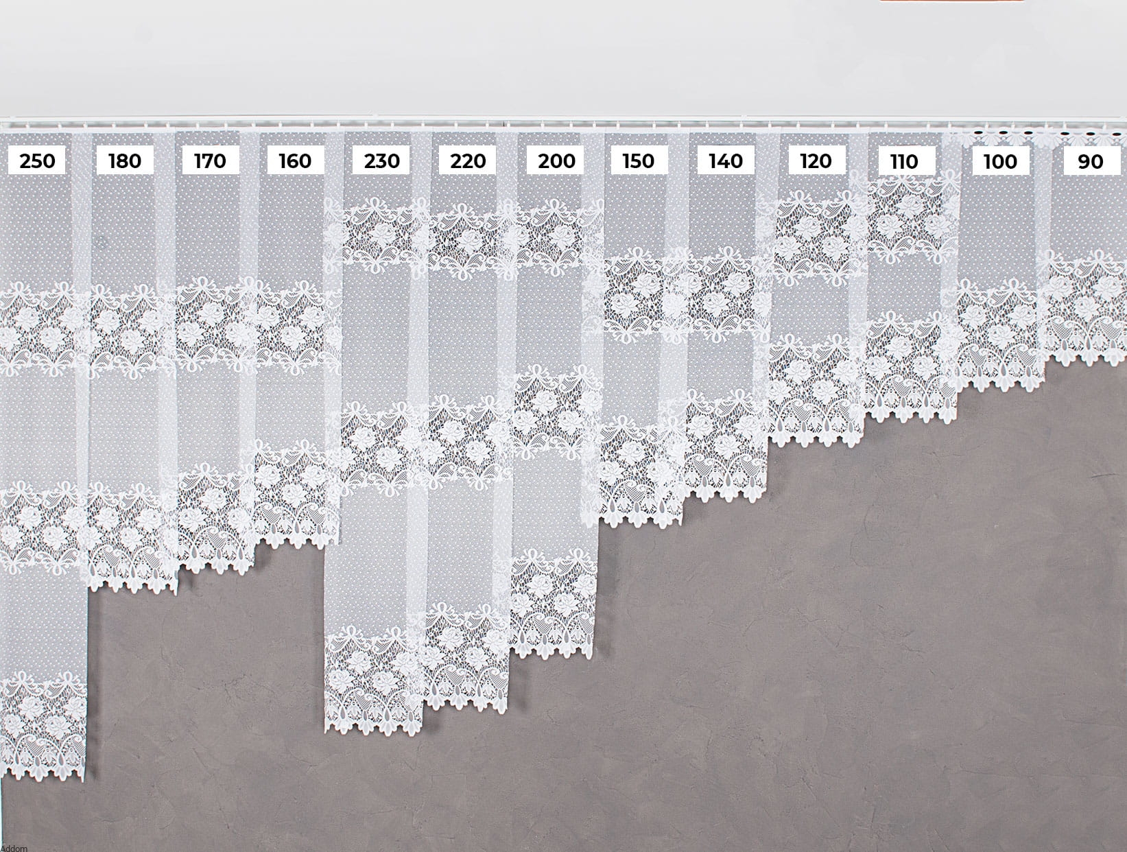 Poza wachlarzem różnych wysokości, w zakładce produktów powiązanych znajdziecie również Państwo lambrekiny o tym wzorze. można je użyć jako zazdrostki, albo górne wykończenie firan. Z firan o wysokości 120 cm powieszonych pionowo można wykonać zasłony, które idealnie komponować się będą z firanami o takim samym wzorze w tle.