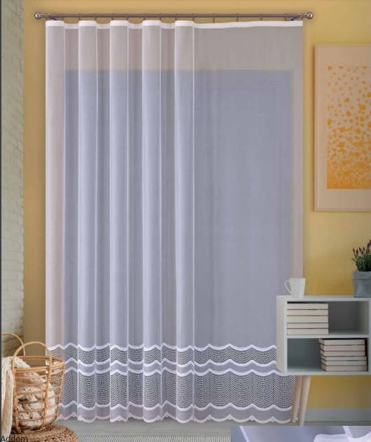 Dostojne acz subtelne w swej formie firany z Kalisza, z dekoracyjną falą na dole firan. Fala ta składa się z kilku węższych fal, gęstych, cieńszych falowanych paseczków, i szerszych, ażurowych fal z mocnym prześwitem. Siatka, którą umieszczono w fali jest gruba, w dotyku jak gipiura, i tak też wygląda. Firany te w wersji wysokości 250 cm powinny być w miejscach przestronnych, gdyż zastawienie ich dołu meblami uniemożliwi widoczność dołu - w takim przypadku z powodzeniem można zastosować firanki krótsze, o wysokości 160 cm, których piękny, ażurowy dół skończy się nad meblami, na wysokości parapetu.