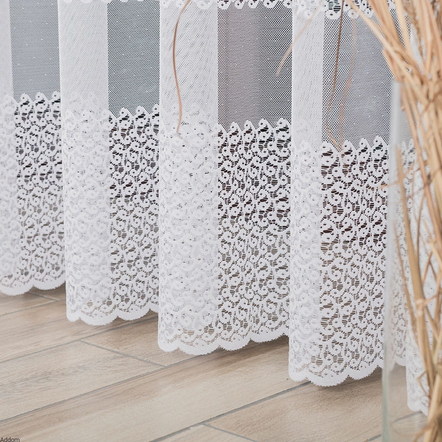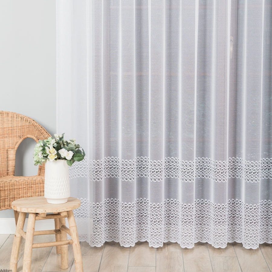 Firany żakardowe o szerokim wachlarzu rozmiarów, od 160, przez 180, do 250 centymetrów, z ciekawym, finezyjnym wzorem, opartym na formach inspirowanych naturą i geometrycznych deseniach. Głównym wzorem jest szeroki pas biegnący dołem, któremu towarzyszy węższy, zlokalizowany nieco wyżej. Firana ma płaski wzorek, a tło strukturę krateczki o dość sporych oczkach, przewiewnych. Firanki są polskie, sprzedawane z metra.