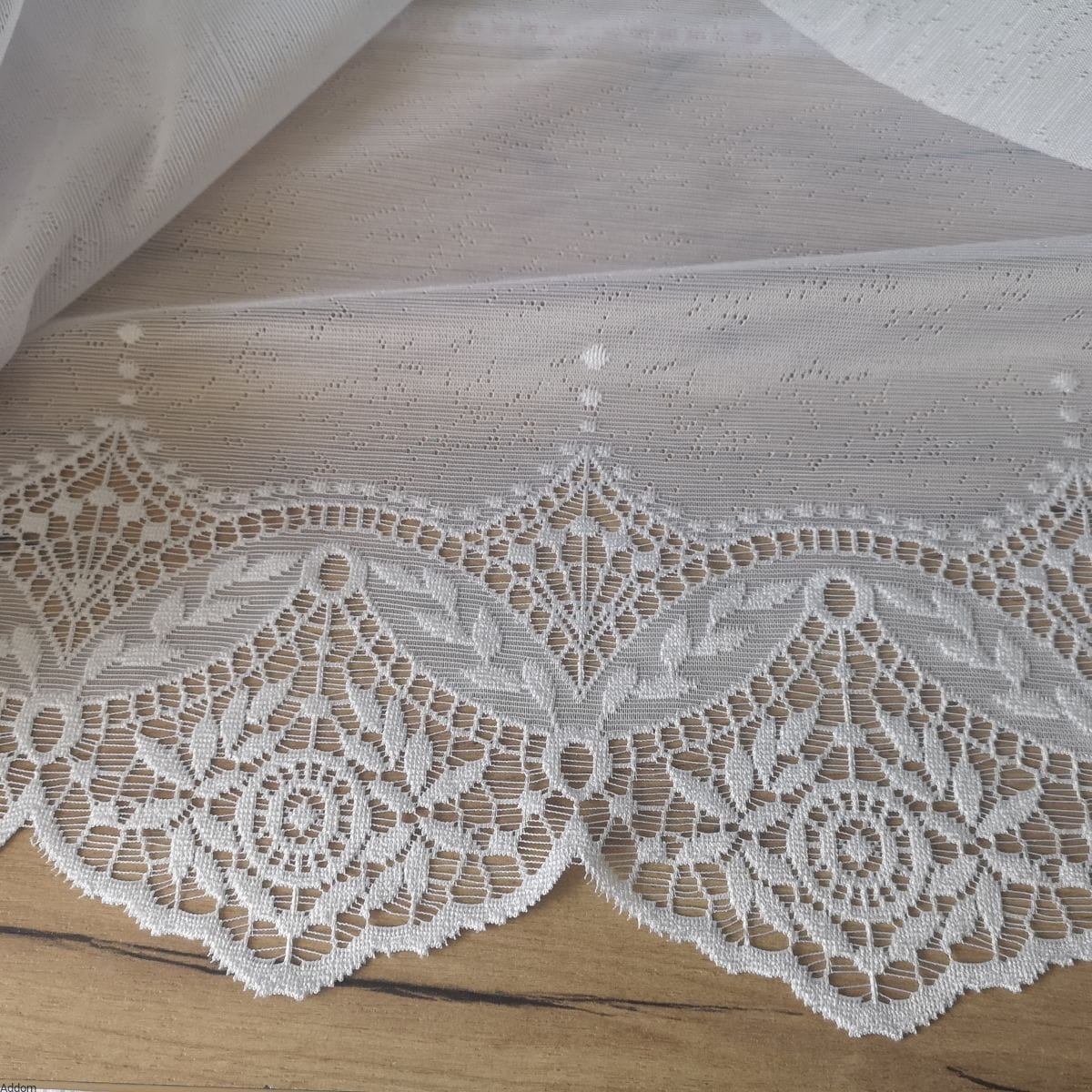 Gęste, nieprzejrzyste firany żakardowe, co nie oznacza, że całkowicie zasłaniają widok, bowiem wpuszczają światło, bardziej precyzyjnie - są półprzejrzyste, dzięki temu, że tło jest z cienkiej nici ale blisko siebie układanej, jednak na tyle luźno, aby były przepuszczalne. Gruby jest natomiast wzór, który wieńczy te firanki dołem. Firanki wyprodukowane w ramach kolekcji Lux Collection, która charakteryzuje się precyzją wykonania, wzorem koronkowym oraz gęstym tłem. Dekoracyjny motyw dołem ma szerokość 20 cm.