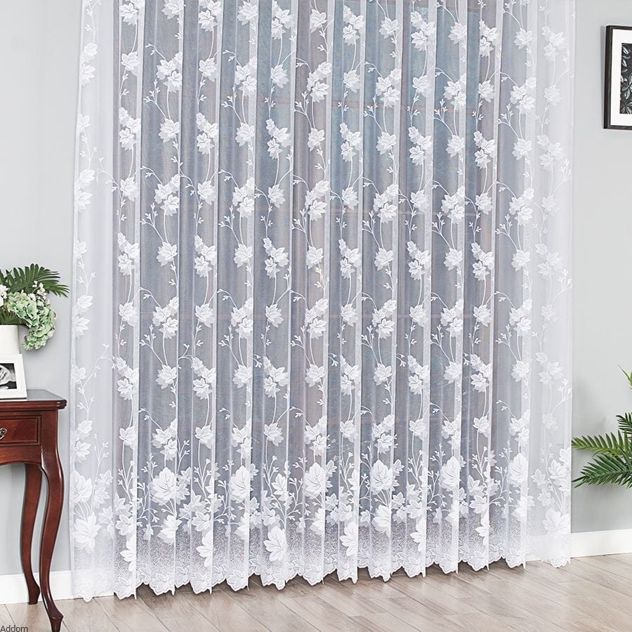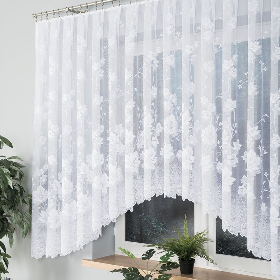 Firanki w duże liście dołem firany, rosnąc w górę stają się mniejsze a firana bardziej przejrzysta. Liście wyrastają z mgiełki wykonanej z nieregularnych kropeczek, które wykończają dół firanki. Żakard tradycyjny, średniej grubości, całość prezentuje się bardzo elegancko. Dostępna w 2 rozmiarach 160x300 i 160x500 cm. Aby wyszukać więcej wzorów w liście, w wyszukiwarce sklepu prosimy wpisać słowo liście lub listki.