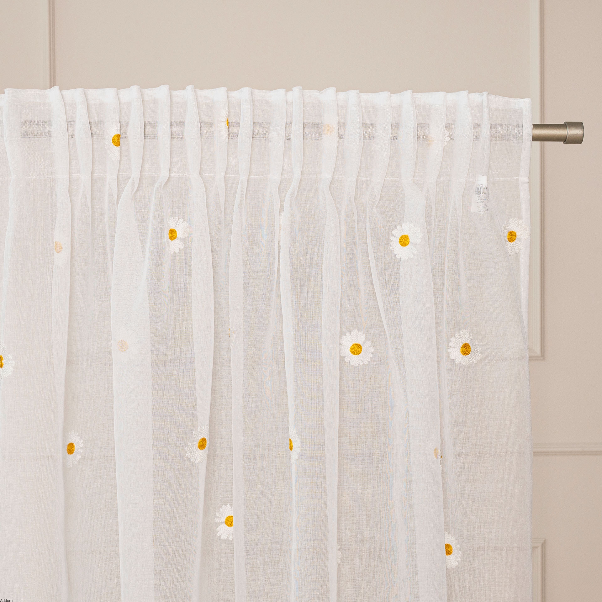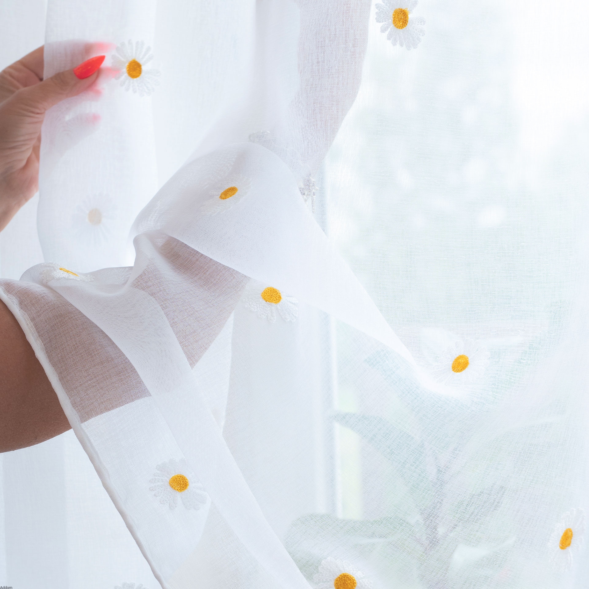 Delikatne, subtelne i lekkie firanki z etaminy haftowane w stokrotki, gotowe do wieszania na karniszu za pomocą przelotek. Firanki mają wzór w dość duże stokrotki rozrzucone na całej firanie w odległości 25 cm od siebie, firana ma też wzór umiejscowiony na dolnej części firany, znajdują się tam nie tylko główki stokrotki, ale również fale. Ten dolny wzór ma 26 cm wysokości.