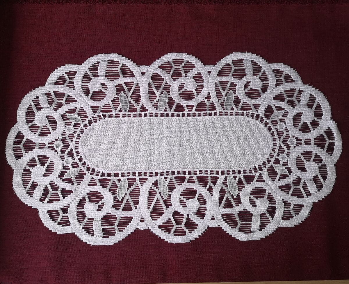 Bieżnik żakardowy, który charakteryzuje klasyczny ornament, z ciekawym ażurem dopełniającym całość tej dekoracji stołu. Kształt bieżnika jest owalny, przędza, która go tworzy jest cienka, ale ściśle przylegająca, co sprawia, że bieżnik jest gruby i lekko sztywny, a ażur dobrze kontrastuje ze zwięzłą dzianiną. Klasyczny model tradycyjnego bieżnika, w którym zdobienie biegnie wokół niewielkiego wypełnionego środka, a brzeg bieżnika po obwodzie zawiera ażurową dekorację, wykończając go dekoracyjnie.