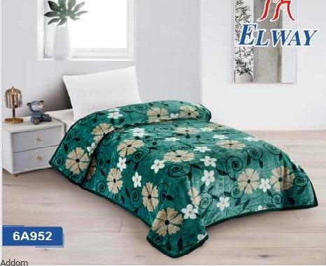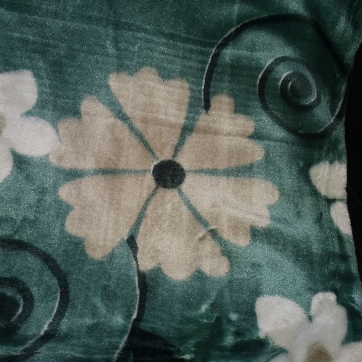Bardzo miły w dotyku kolorowy koc usłany wielobarwnymi kwiatami - kremowymi i beżowymi, wykonany w znacznej mierze z akrylu. Tło to zieleń o miętowym odcieniu, a wzory prócz kwiatów to jeszcze czarne gałązeczki i spiralki. Grafika umieszczona jest na pulchnym akrylu - miękkim pluszowym długim włosiu wysoko strzyżonym, w rozmiarze 160x210. Kocyk jest gruby, o wadze 1,9kg, zapakowany w walizeczkę. Brzegi obszyte są szeroką, matową lamówką.