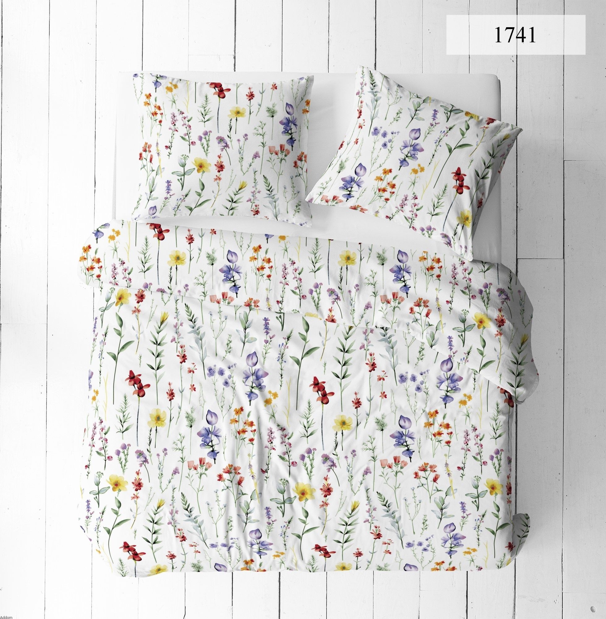 Komplet kolorowej pościeli flanelowej, w rozmiarze poszwy 200x220, do której w zestawie znajdują się także widoczne dwie poszewki na duże poduchy 70x80. Pościel jest bawełniana, jak wszystkie flanele w naszym sklepie, i uszyta z jednego kawałka materiału. W komplecie tym zadziwia żywa kolorystyka roślinności, w której wesołe, żywe kolory kontrastują z białym kolorem tła.