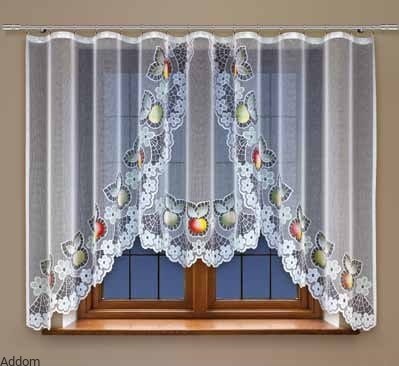 Firanki uniwersalne, choć wersje krótkie zdają się być idealne do okien kuchennych, dłuższe wersje efektownie ozdobią inne pomieszczenia. To firanki, które stanowi elegancki żakard, dołem wykończony tak, jakby wykończała ją koronka. To wykończenie dołem jest kulminacyjnym punktem dekoracyjnym firany, choć górą biegnie równie efektowny rząd kwiatów i pięknych liści. Boki są również ciekawie wykończone, pół spiralkami. Górą oczywiście doszyto taśmę marszczącą, jak w każdych firanach marki Haft.